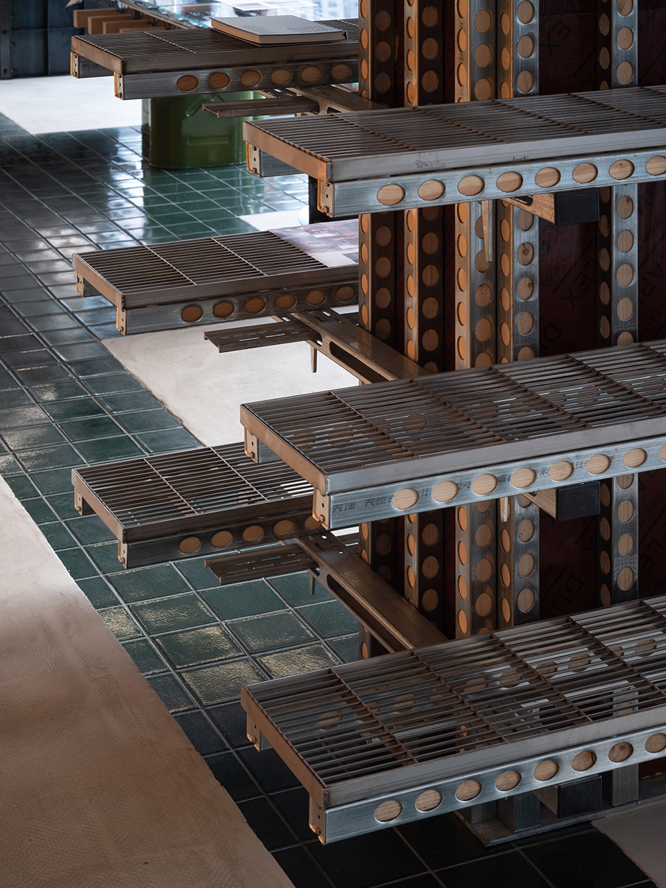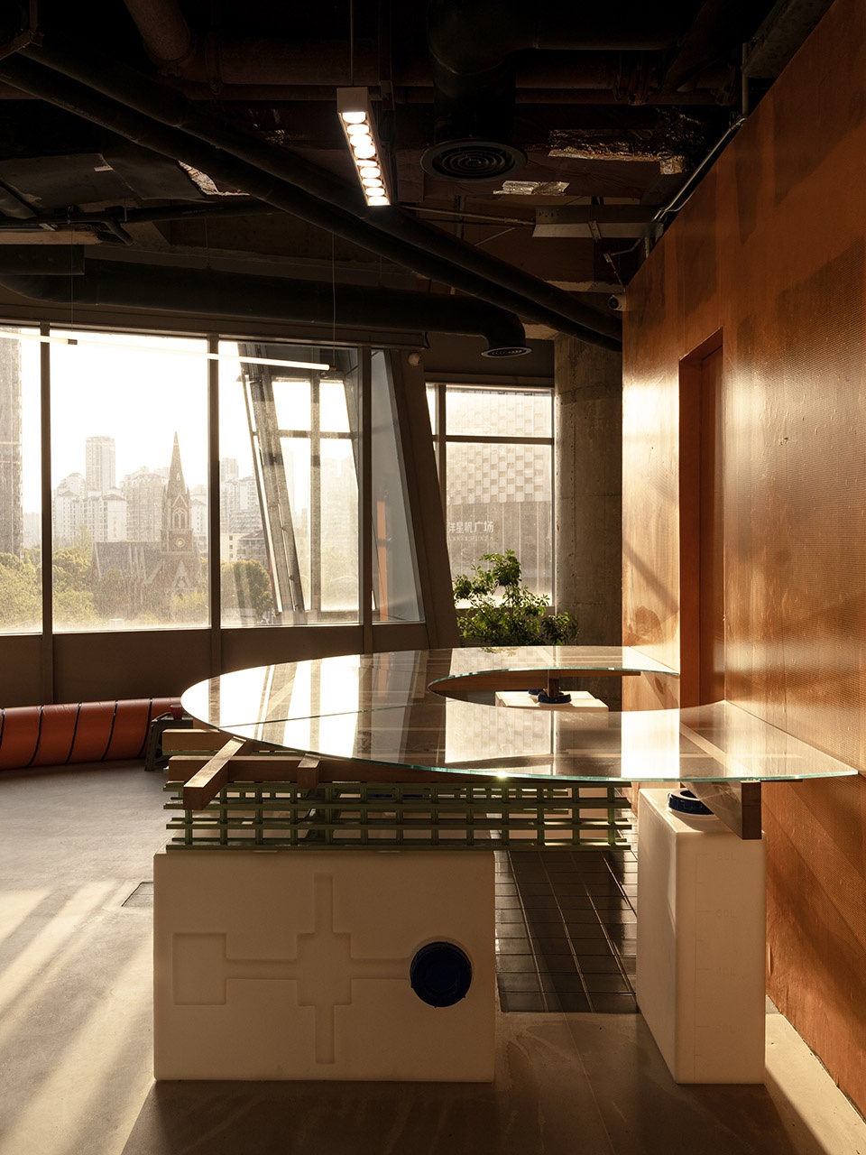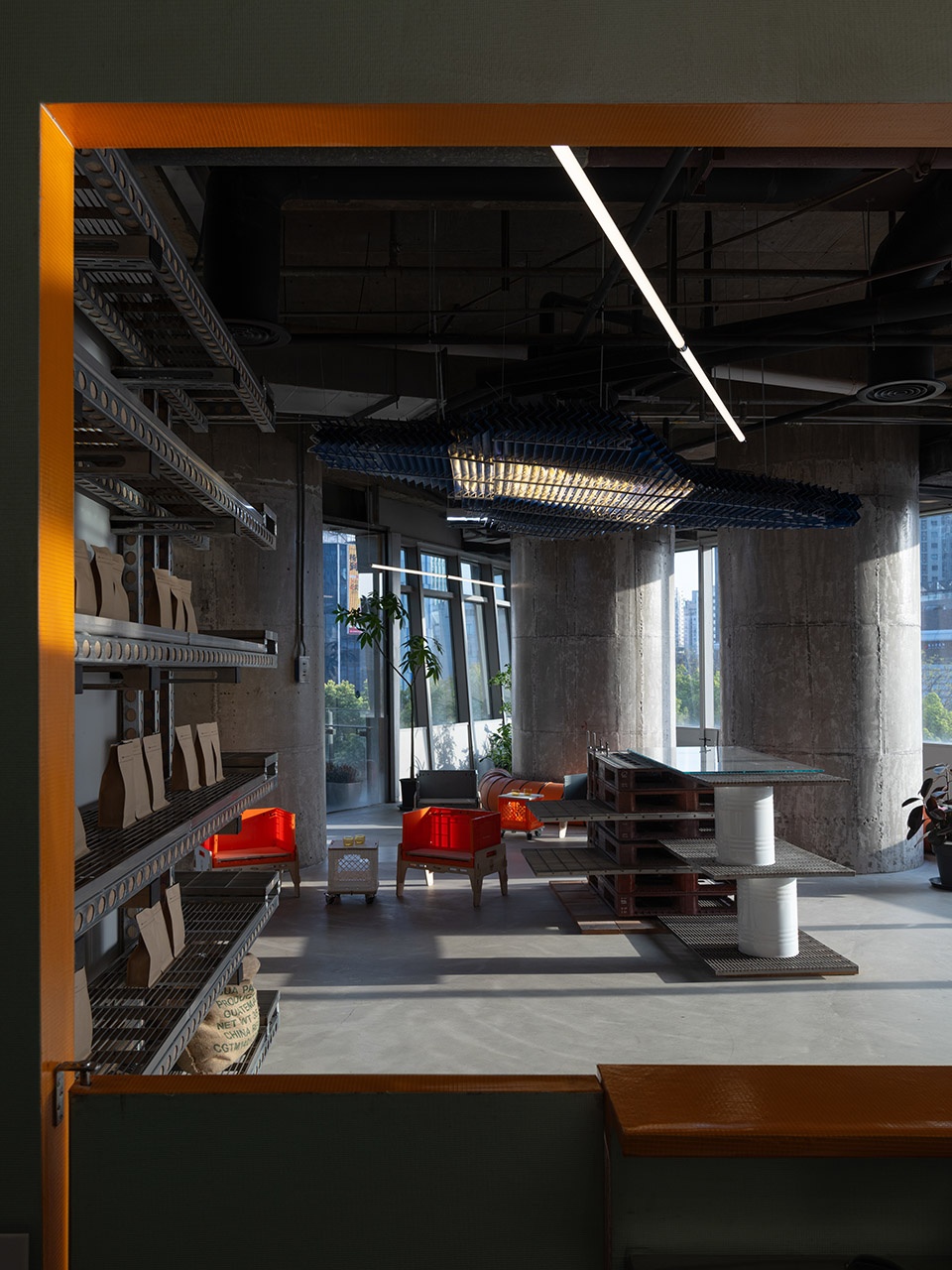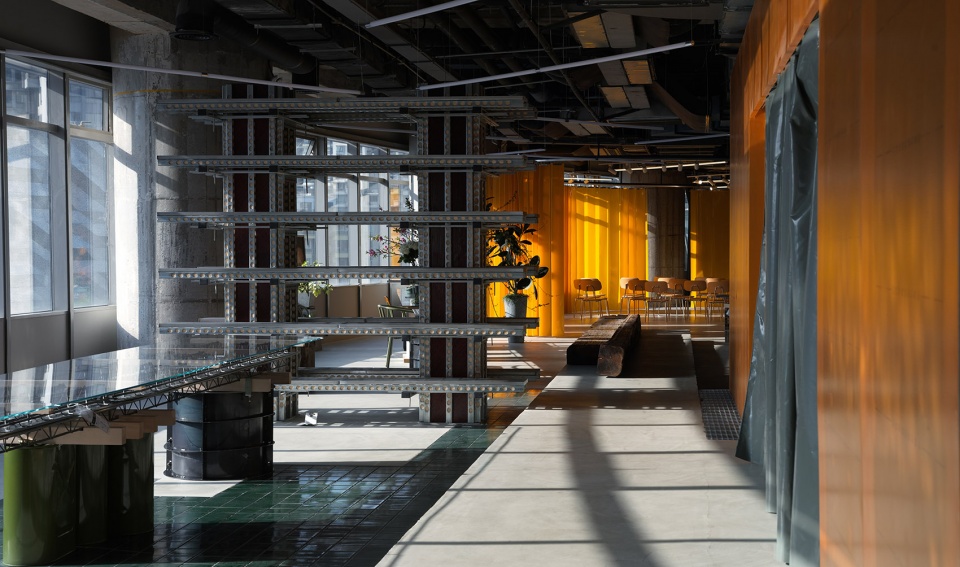 空间中的家具延续了以楼承板,砖机托板等建造材料为基础的长桌,并引入了以快速混凝土预制模板系统为材料的承载架单元。物流是消费的重要支撑,液态物体的容器,堆栈的货台,固体矿物的吊蓝,都成为家具的支撑体。工厂的通风隔扇被改造成吊灯,隔间门帘来自卡车苫布。作为空间分隔的工厂防火帘,作成座椅的防火通风管道,贴上墙的防火塑料薄膜让空间充满橘红色,这种色彩不是设计者的刻意而为,而是防火要求下现成品具备的材料本色。色彩作为美学要素反映了时代的技术信息。