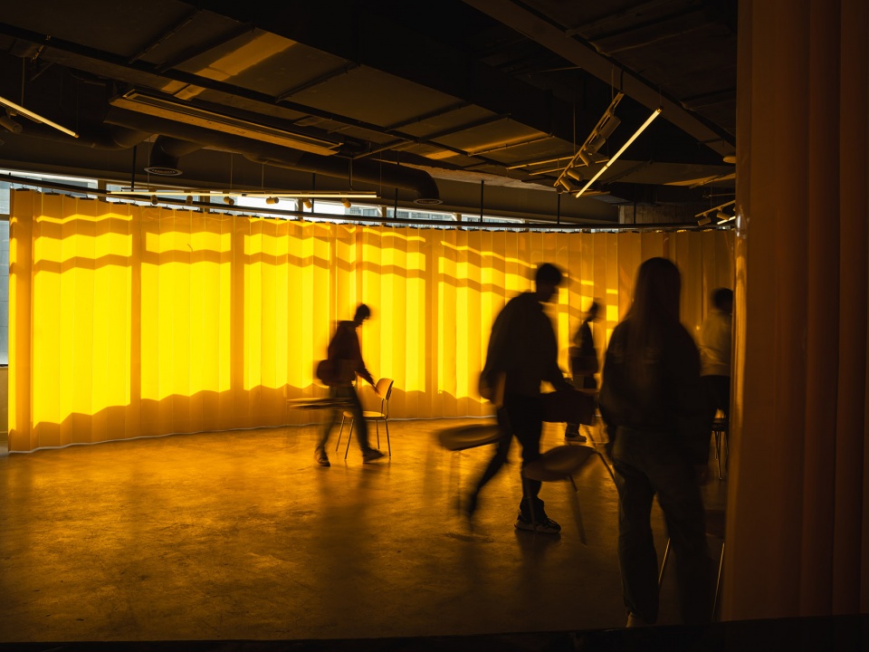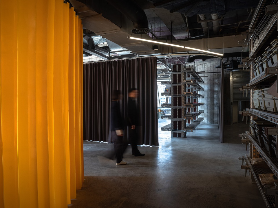 防火软帘:由透明或半透明的PVC条状片材组成的柔性门帘,兼具防火、防水等特性,广泛应用于工业、商业和冷链等领域。其主要作用是隔离环境、保温防尘、节能降耗。在889GLO艺术空间中作为活动空间的帘子。