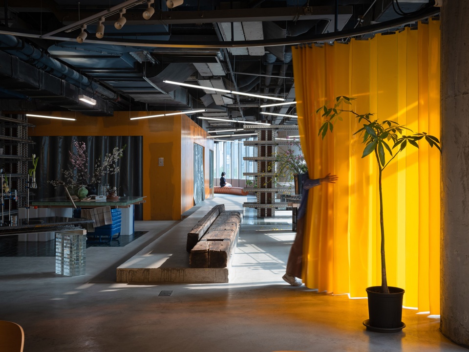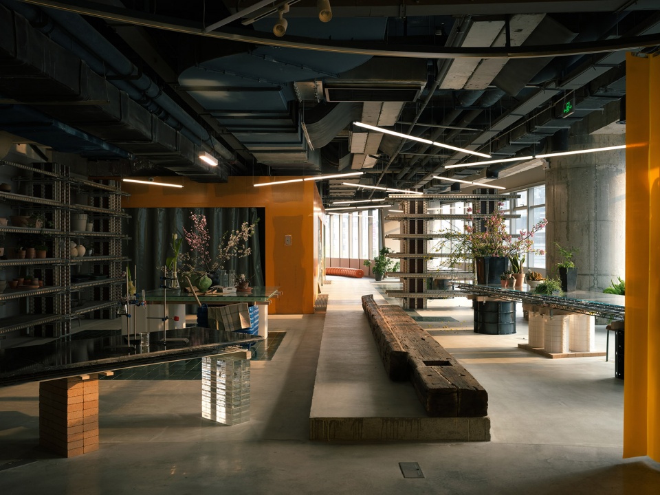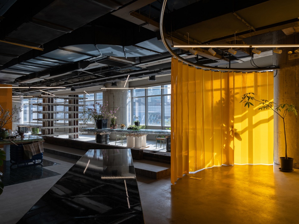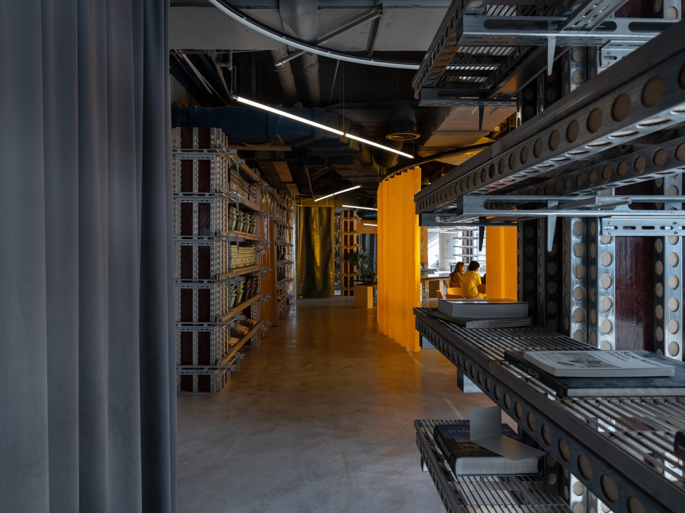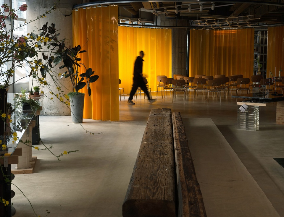 Envisioned as a hybrid cultural space combining library, lifestyle showcase, and art platform, 889GLO’s design preserves the building’s historical layers while creating fluid new connections. The removal of previous tenants’ partitions opened panoramic city views along the southern and western facades, while the slightly elevated corridor linking former small rooms was intentionally preserved. The ceiling maintains its archaeological record of different occupants through residual paint layers on exposed concrete. The spatial sequence unfolds as a continuous narrative: from the cafe merging with plant-filled terraces, through gallery areas flanked by orange fireproof membranes, past floral workspaces with repurposed gardening tables, to the yellow-curtained lecture arena, finally arriving at the monumental library space defined by towering bookshelves. Throughout, boundaries dissolve in favor of spatial permeability.