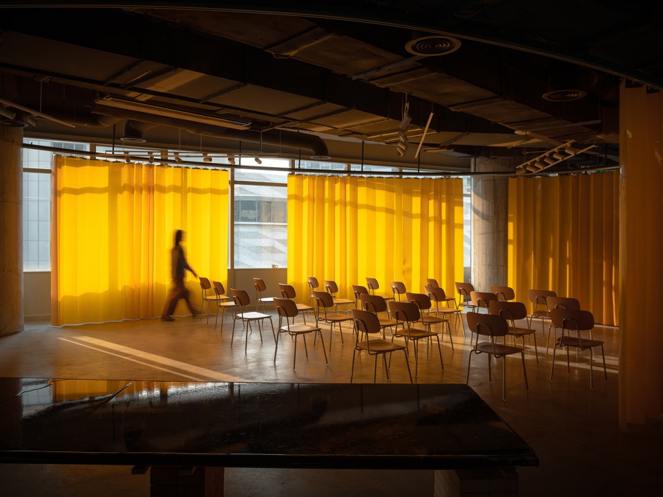 构想中的889GLO是一个集合图书馆,生活方式,艺术分享与展示为一体的新型文化空间。在拆除了前租户的隔断后,建筑体从南到西观望整个城市的立面打开了,原地面连贯所有小房间的微微抬高走廊被保留下来。前任不同租户各自粉刷的天花板色彩和原本吊顶里无粉刷的混凝土一起保留下来。空间的入口透明的玻璃与充满盆栽的大阳台连为一体。以Cafe的空间开始,经过贴着橘红色的防火塑胶膜的隔间墙壁,两张长桌和展示架下的画廊和剧场空间,有着方形的园艺整理桌的花艺空间,一直到黄色的标志性帘子围成的演讲,分享的区域。再到最里面经过灰色帘子,停步在巨大书架组成的图书馆空间。整个空间没有断然的界限,彼此流动呼吸。