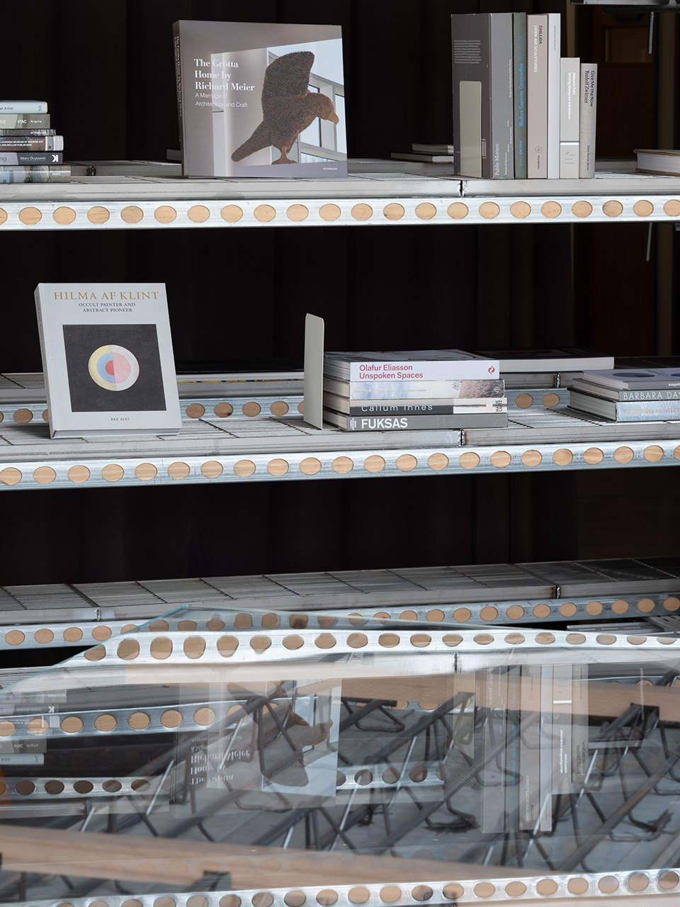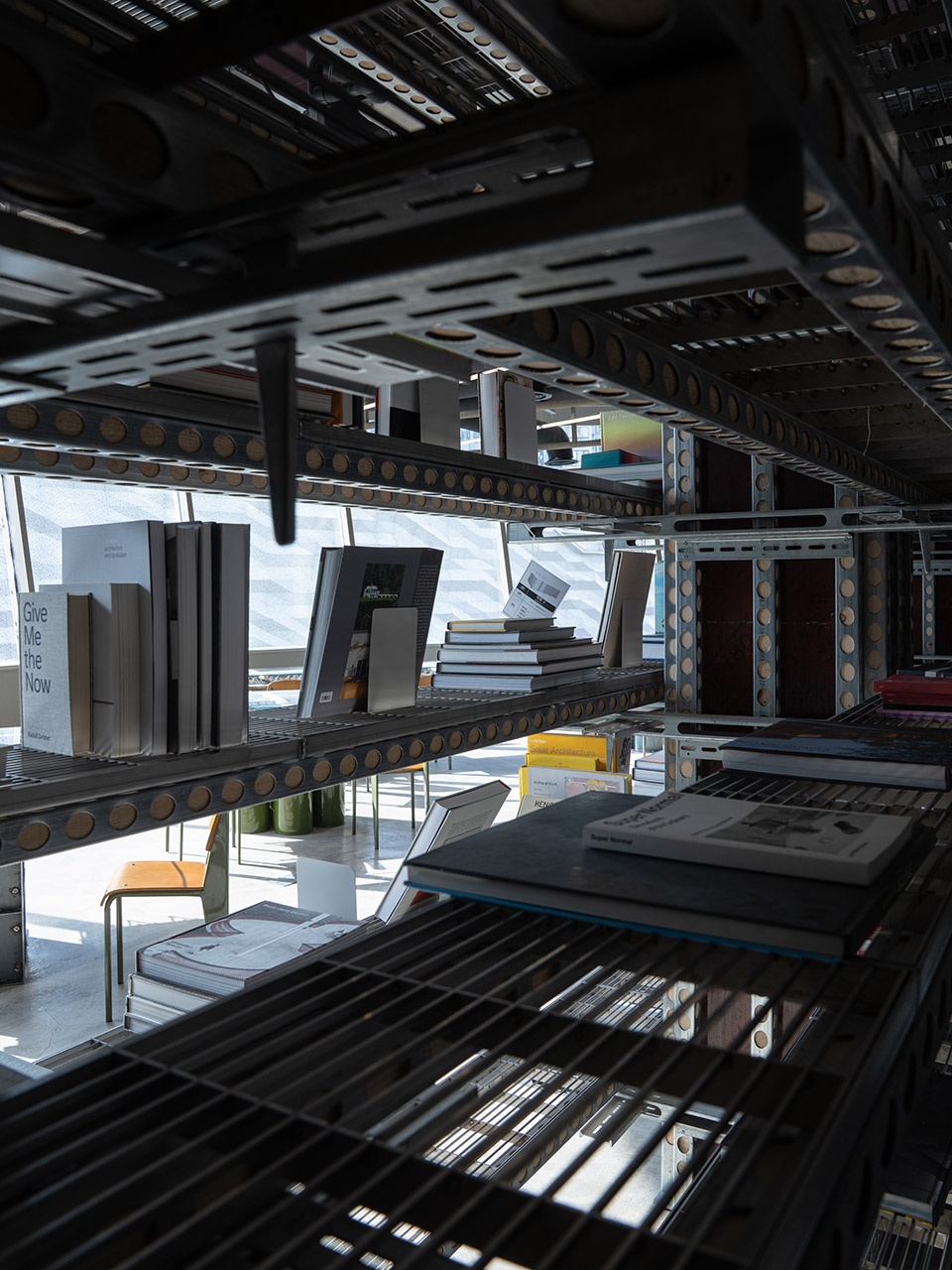 Floor Bearing Plates: A construction element used in concrete casting, serving both as formwork and steel reinforcement. Mass-produced through factory welding, it offers high load-bearing capacity for large structural spans. In the 889GLO Art Space, it acts as a universal support for display platforms and library tabletops.