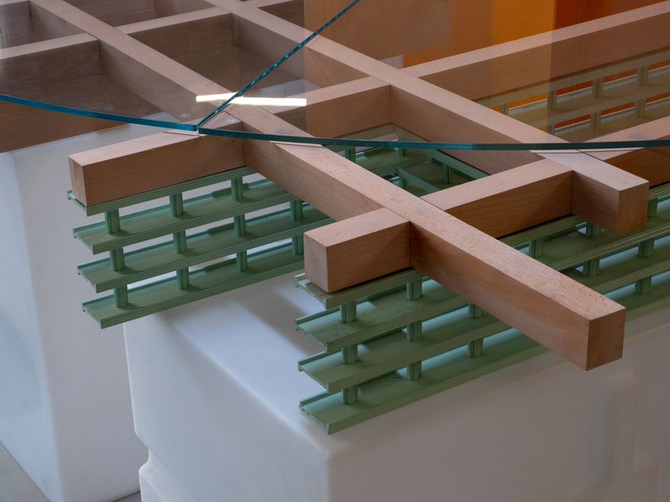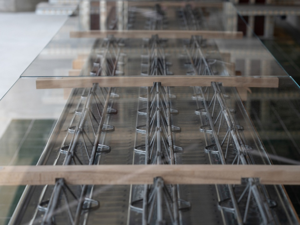 楼承板:混凝土工艺中同时作为浇筑模板和内部配筋,在工厂中大批量焊接制造,具有较大的结构跨度的承载力,在889GLO艺术空间中作为展台和图书馆桌面的通用支撑。