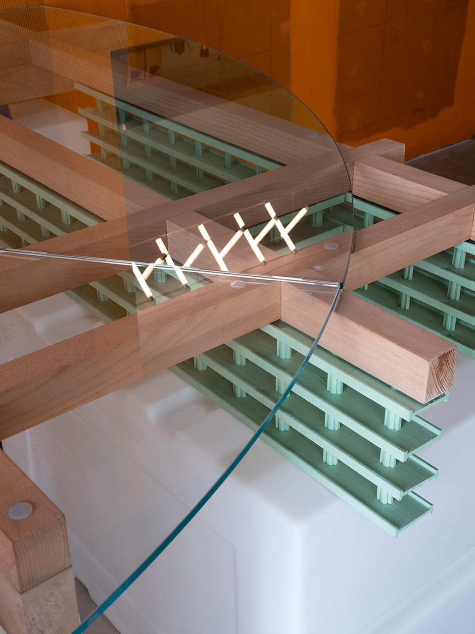 Fiberglass Grating: A grid-like material made from fiberglass and resin composite, featuring lightweight, high strength, and corrosion resistance. Widely used in industrial, construction, and municipal applications. In the 889GLO Art Space, it serves as furniture support. Metal Storage Crate: A high-duty, reusable standardized container designed for efficient and secure cargo transport and storage. In the 889GLO Art Space, it functions as furniture support.