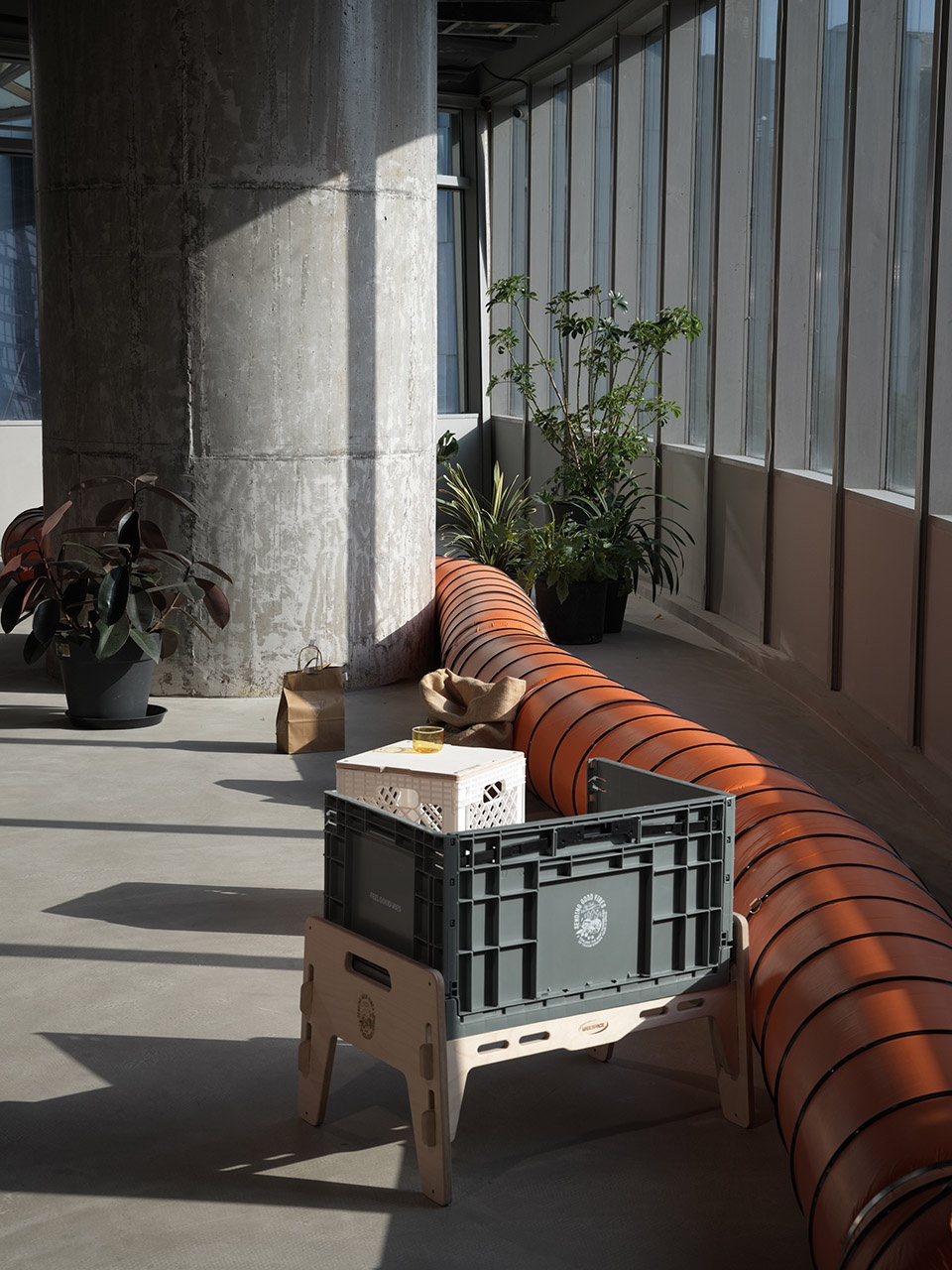 PVC Fireproof Ventilation Duct: A flame-retardant plastic duct designed for building ventilation systems, combining the lightweight and corrosion-resistant properties of PVC with fire safety features. Filled with foam plastic, it is repurposed as seating in the Café area of the 889GLO Art Space.