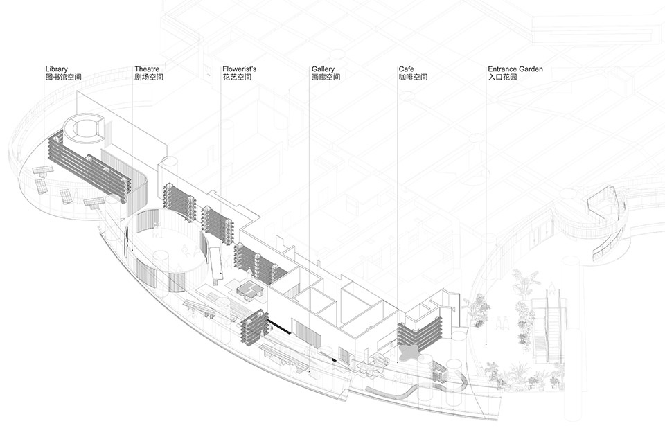 ▼从剧场空间看向花艺空间和画廊空间,Intersection of gallery space, floral space and theatre space