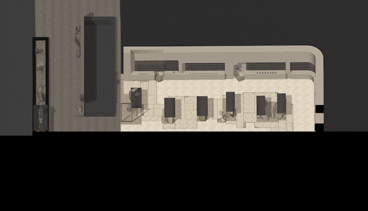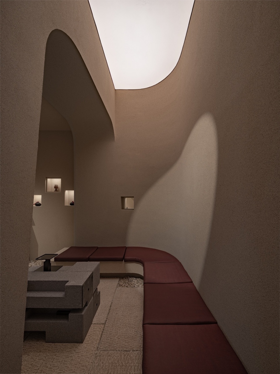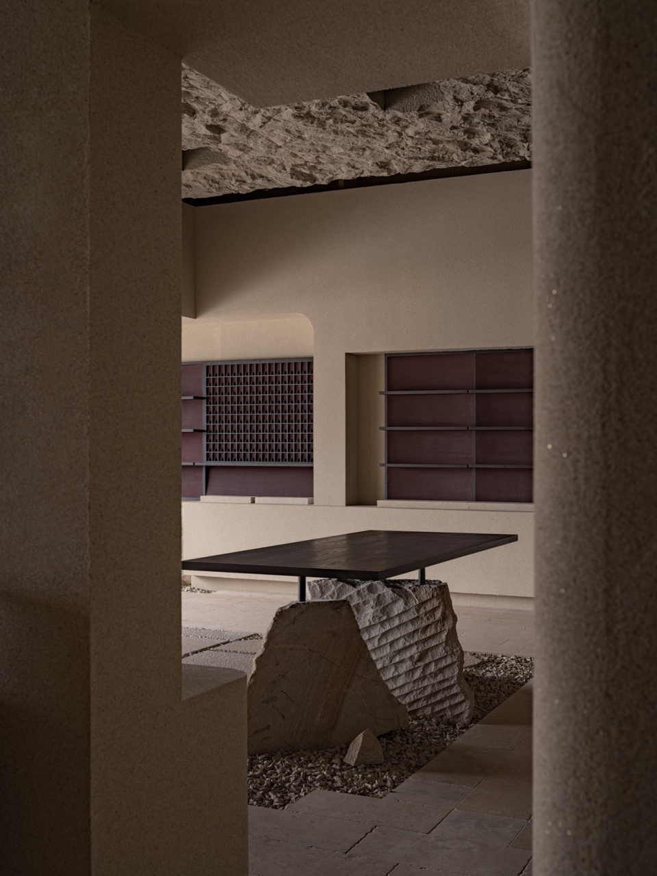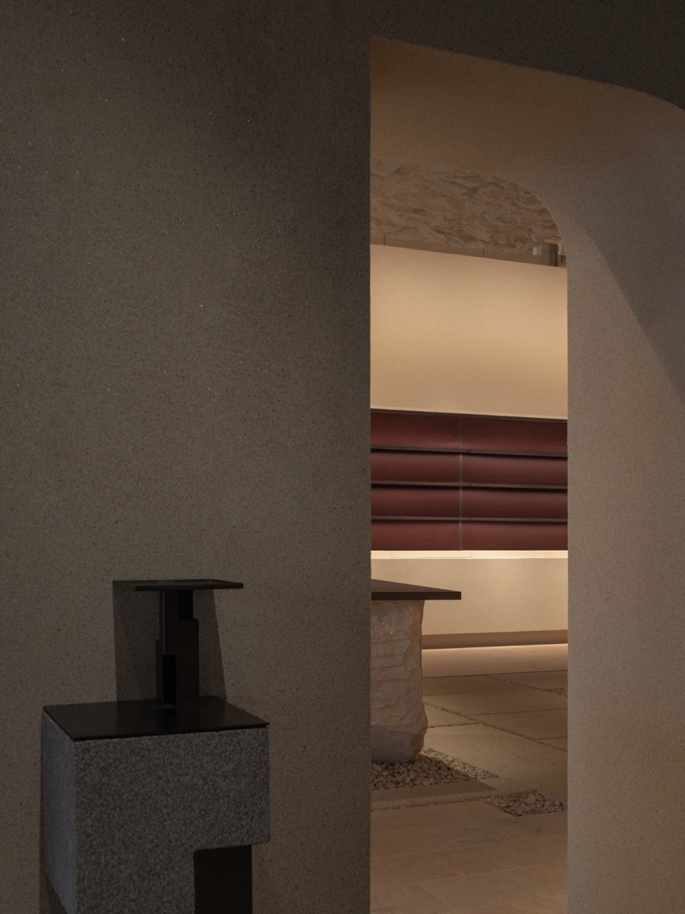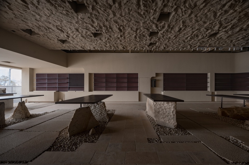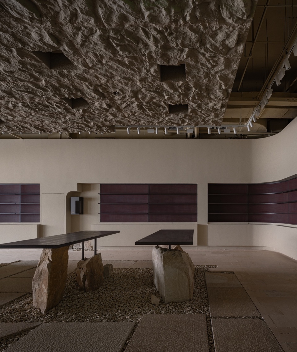 The entire shop has a depth of approximately 20 meters and a width of 13 meters. At one-third of the frontage width, it is divided into two parts by three columns. The wider section, measuring 9 meters by 20 meters, serves as the “Stone Chamber,” functioning as the main product display and experience area as well as the cashier. The narrower section, approximately 3 meters by 20 meters, is designated as the “Stone Corridor,” which serves as a platform for public cultural activities. The clients regularly invites artists and Boutique brands to hold exhibitions here.