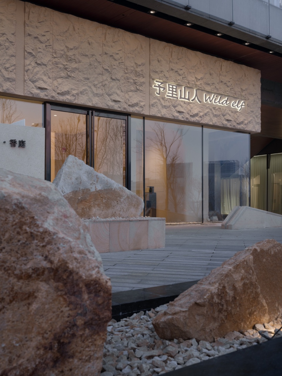 Taking advantage of the two floor-to-ceiling curtain walls, some natural structures in the grotto, such as fragmentary mountains and residual shoals, extend from the interior to the exterior. They not only resolve the height difference between the indoor and the outdoor but also serve as an invitation to the pedestrians, seamlessly connecting the interior and the exterior. In the rock landscape, lamps are randomly embedded, in which the products can be placed, forming a natural “open-air fragrance museum” in the outdoor venue.