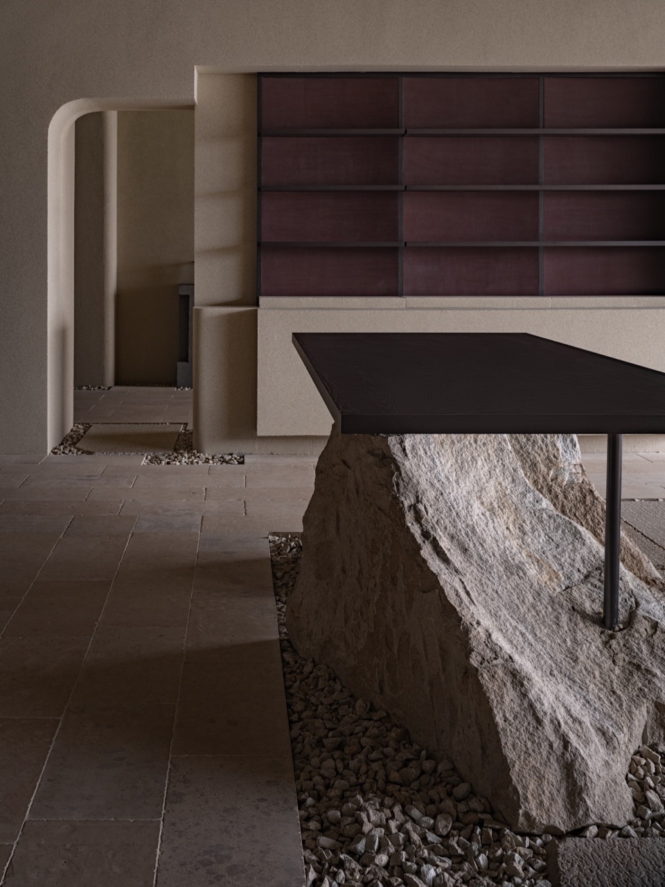 自然的原石直接用于家具的制作是本次空间设计最大的挑战。为此业主带着我们一起驱车前往河北保定逐个考察石料场。所有的石头逐个挑选,直至陪着工人一起加工成想要的大小、形状和肌理。最终再通过现场的摆置,落位于他们的该有的的位置。