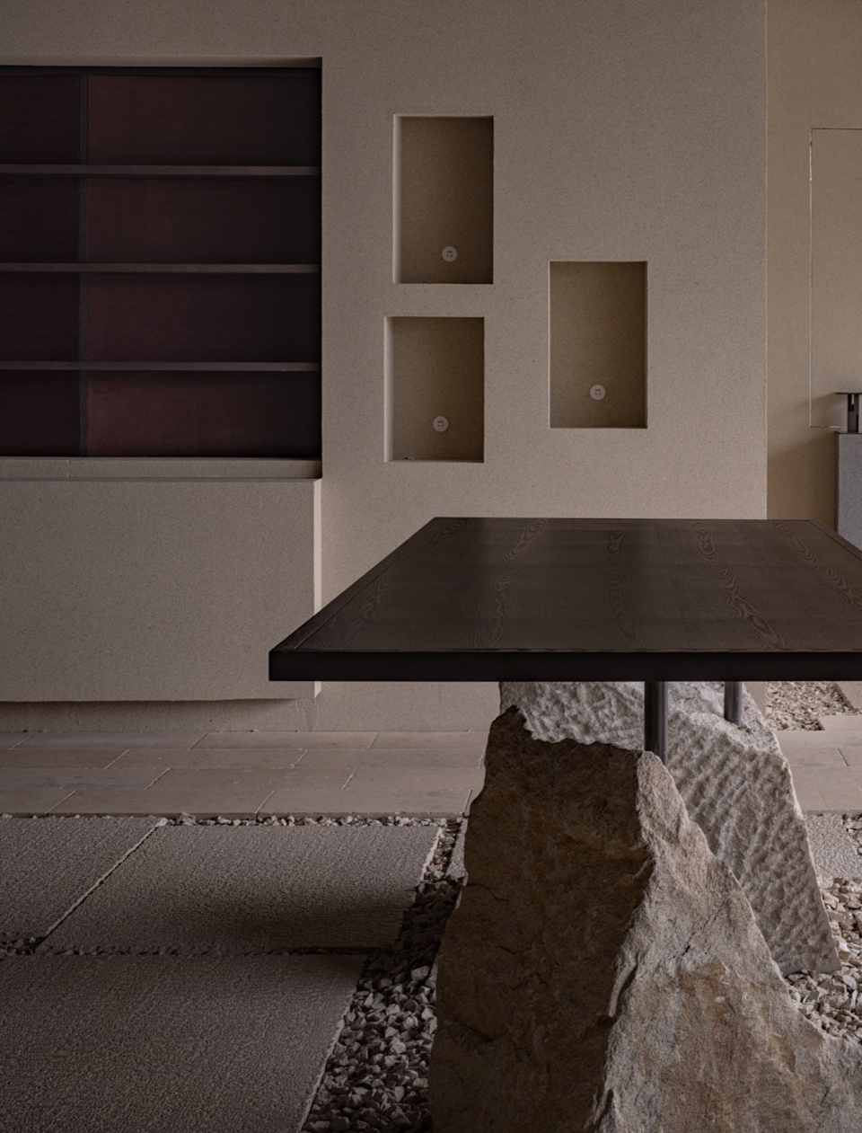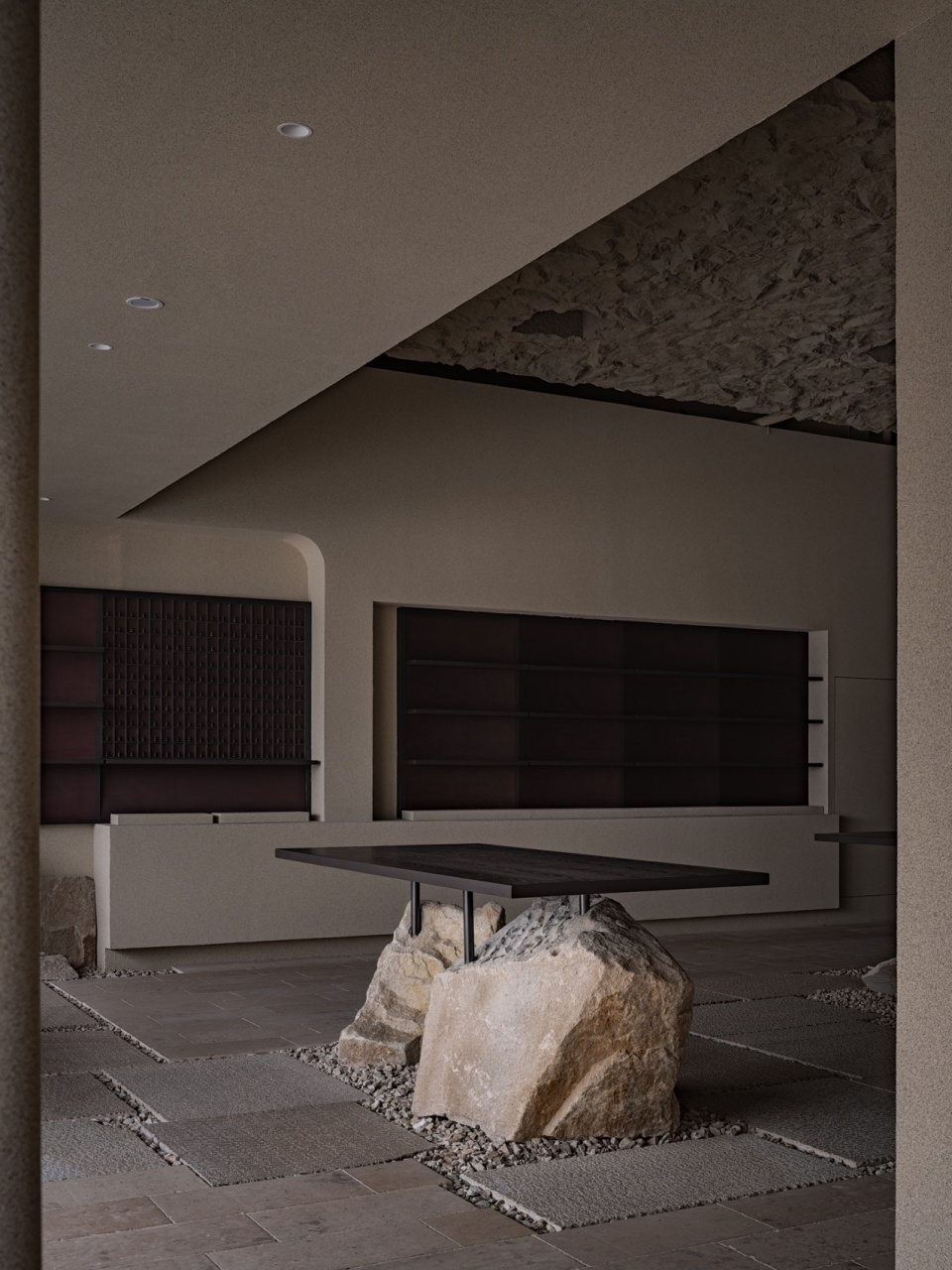 The most significant challenge in this spatial design was employing raw stones for furniture. We, along with the clients, were on a driving tour to visit stone quarries one by one in Baoding, Hebei. Every piece of rock was carefully selected, and we stayed with the workers throughout the processing to ensure they were shaped into the aimed size, form, and texture. Consequently, through on-site arrangement, each stone was positioned precisely where it belonged in the appropriate status.
