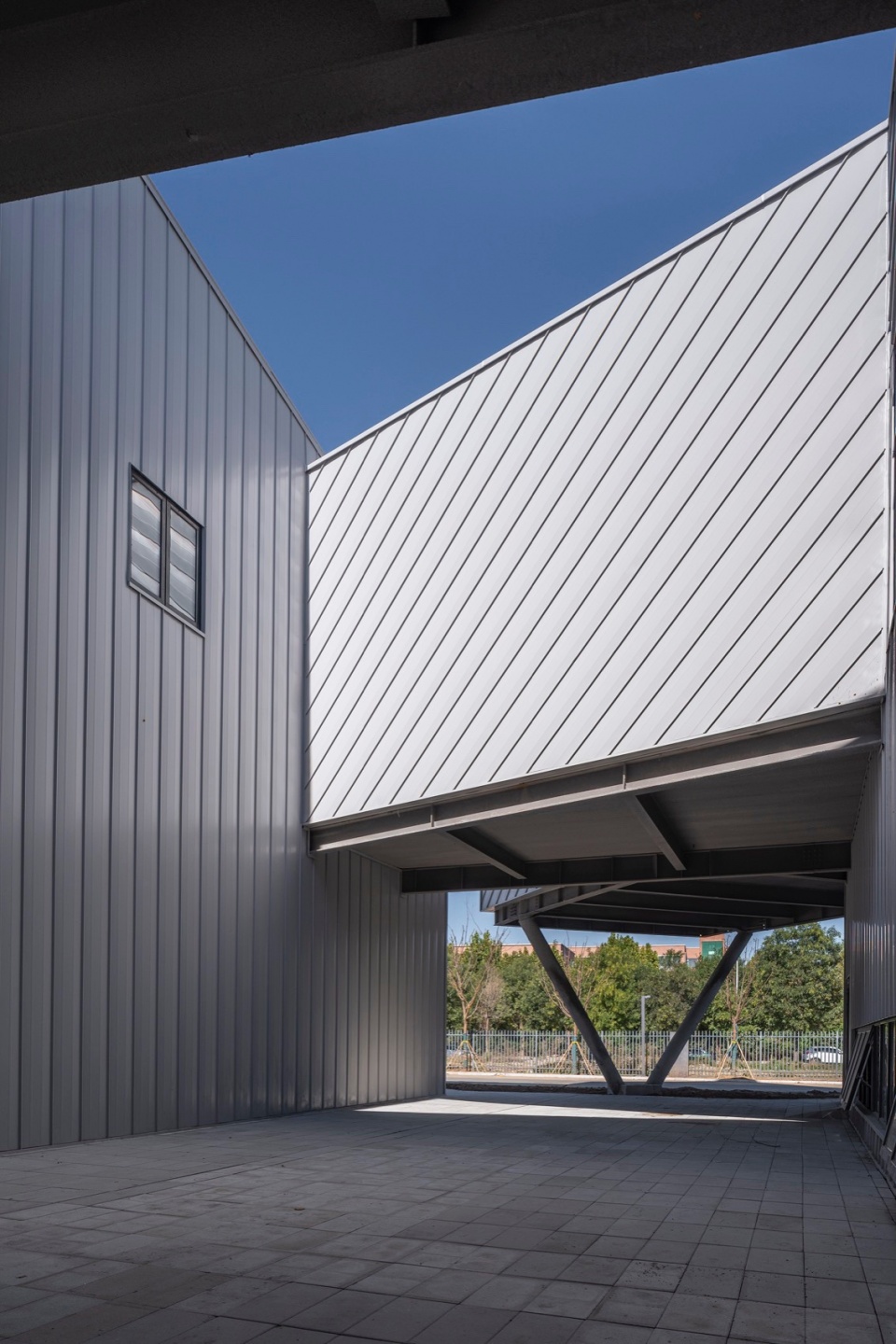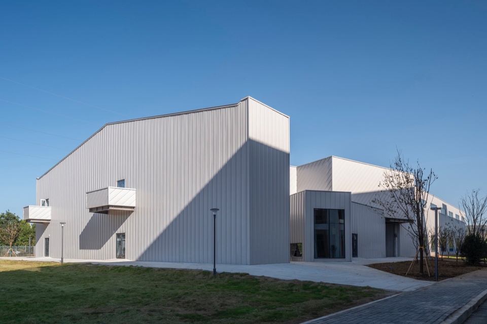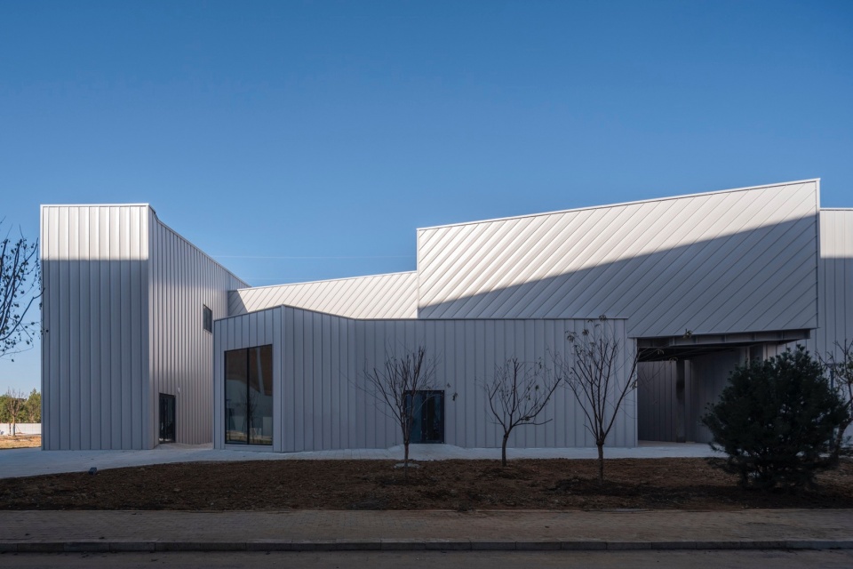 马术馆与美术馆位于校园北门入口的东侧。基于用地与预算的考虑,马术馆与美术馆在建筑形态上,首先要满足标准的室内马术场地的尺寸规格。因此它在形态上首先是一个简单的门式刚架结构的矩形空间。这个矩形的空间最西侧的部分被分离出来成为了建筑的主立面。