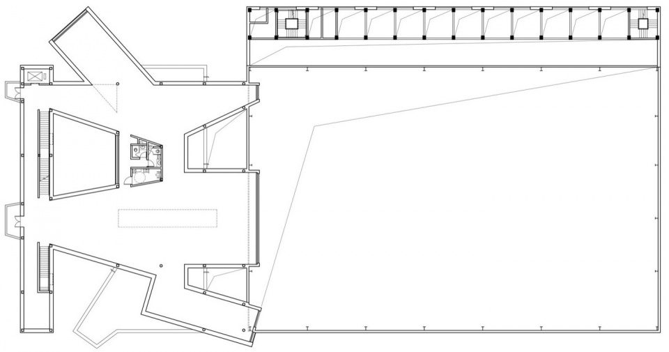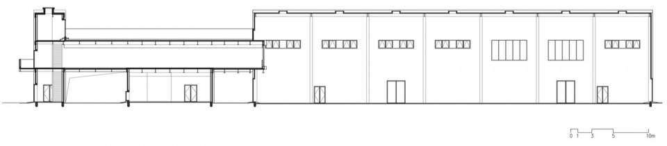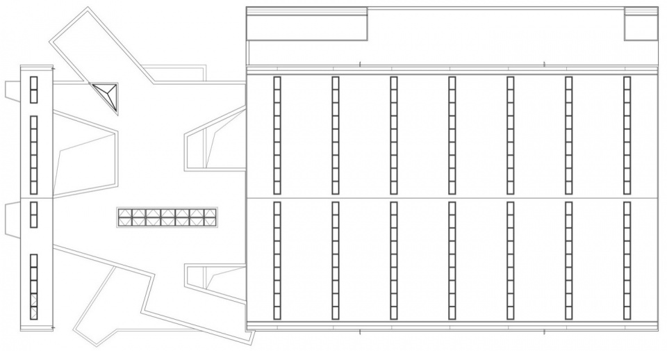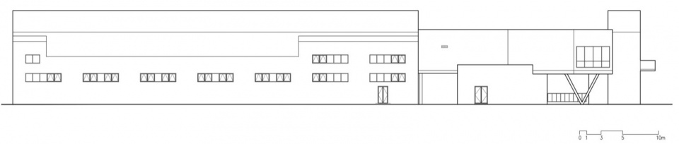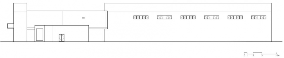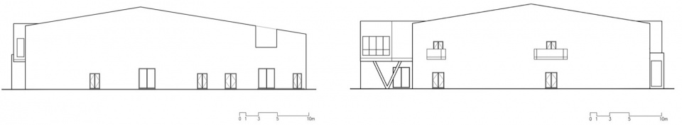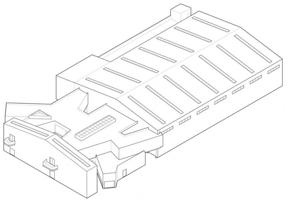 这个双坡的立面与普通的钢结构厂房的立面的唯一区别仅仅是在立面上出挑了两个小阳台以及下面的入口。如此朴实无华的立面却将马房的原始形态——小木屋和美术馆的原始形态——巴西利卡,融为一体。在功能上这个窄长的空间既是画廊也是组织室内交通的空间。