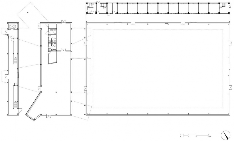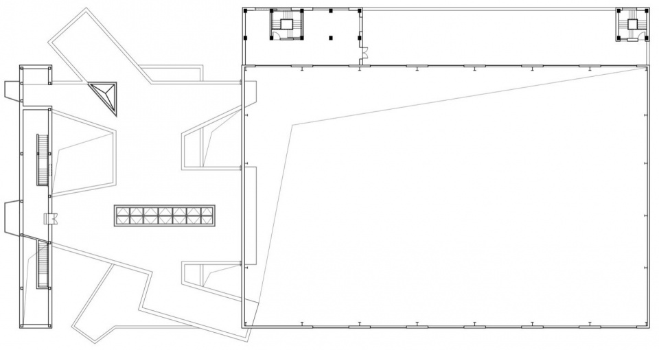 这个位于建筑中间的不规则形态,使得这个呆板的矩形空间变得灵动起来,并创造出了一些类似院落的空间将立面建筑与美术馆以及位于东侧的马术馆连接起来。此外,立面建筑的三层通往这里的屋面,使得屋面的空间得以充分利用。而在建筑的东侧则是由常驻10匹马的马厩、服务用房和室内马术场组成的马术馆。其中马厩及其服务型用房位于北侧,而室内马术场位于南侧。