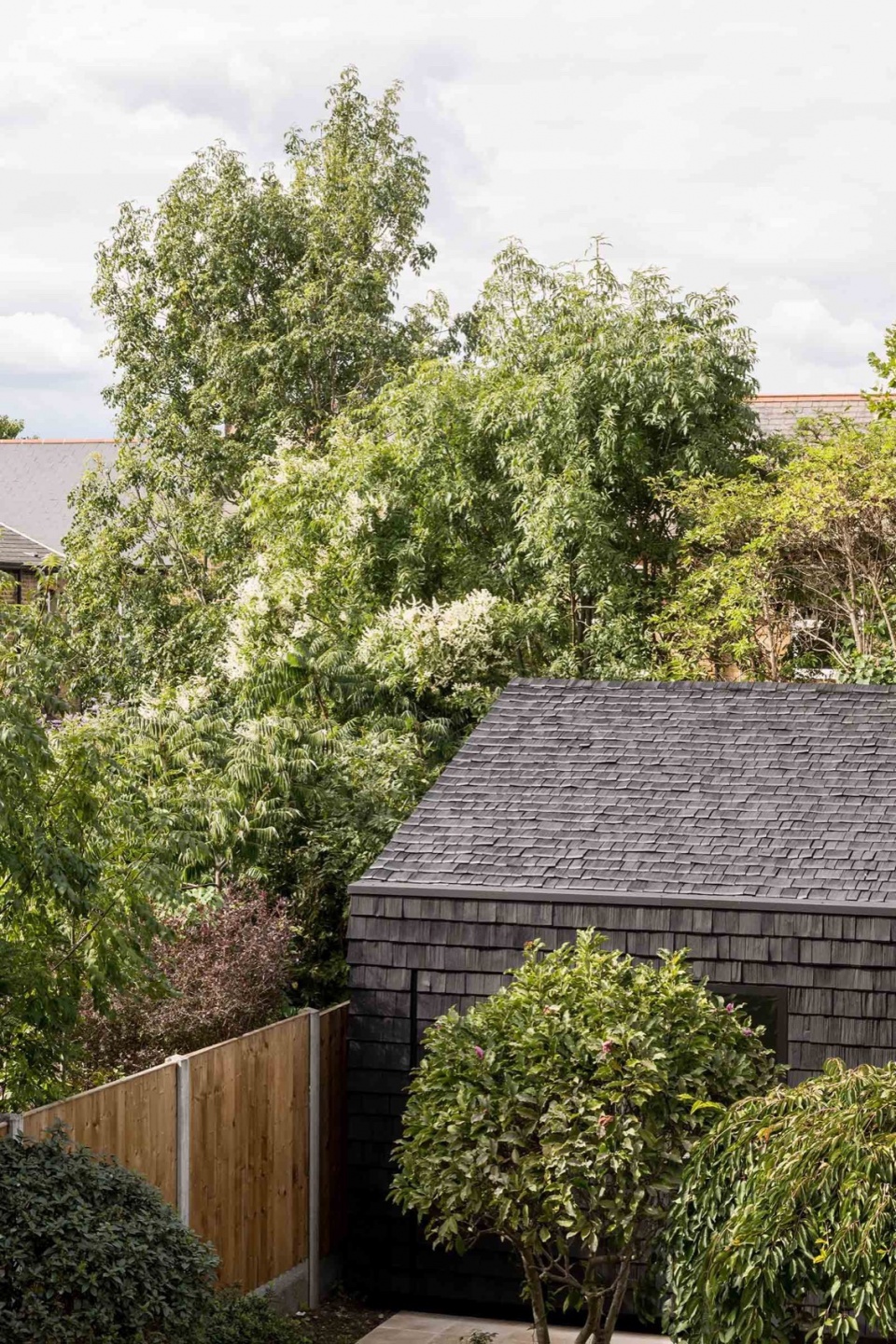 All glazing is triple glazed. The insulation specified outperforms current Building Regulations requirements so that only one small electric radiator (powered by solar panels on the roof of the main house) is required for heating purposes. All the existing mature trees in the garden were retained. This partially conceals the overall form of the studio, with the black finish of the shingles providing a backdrop to the changing daylight and passing seasons.