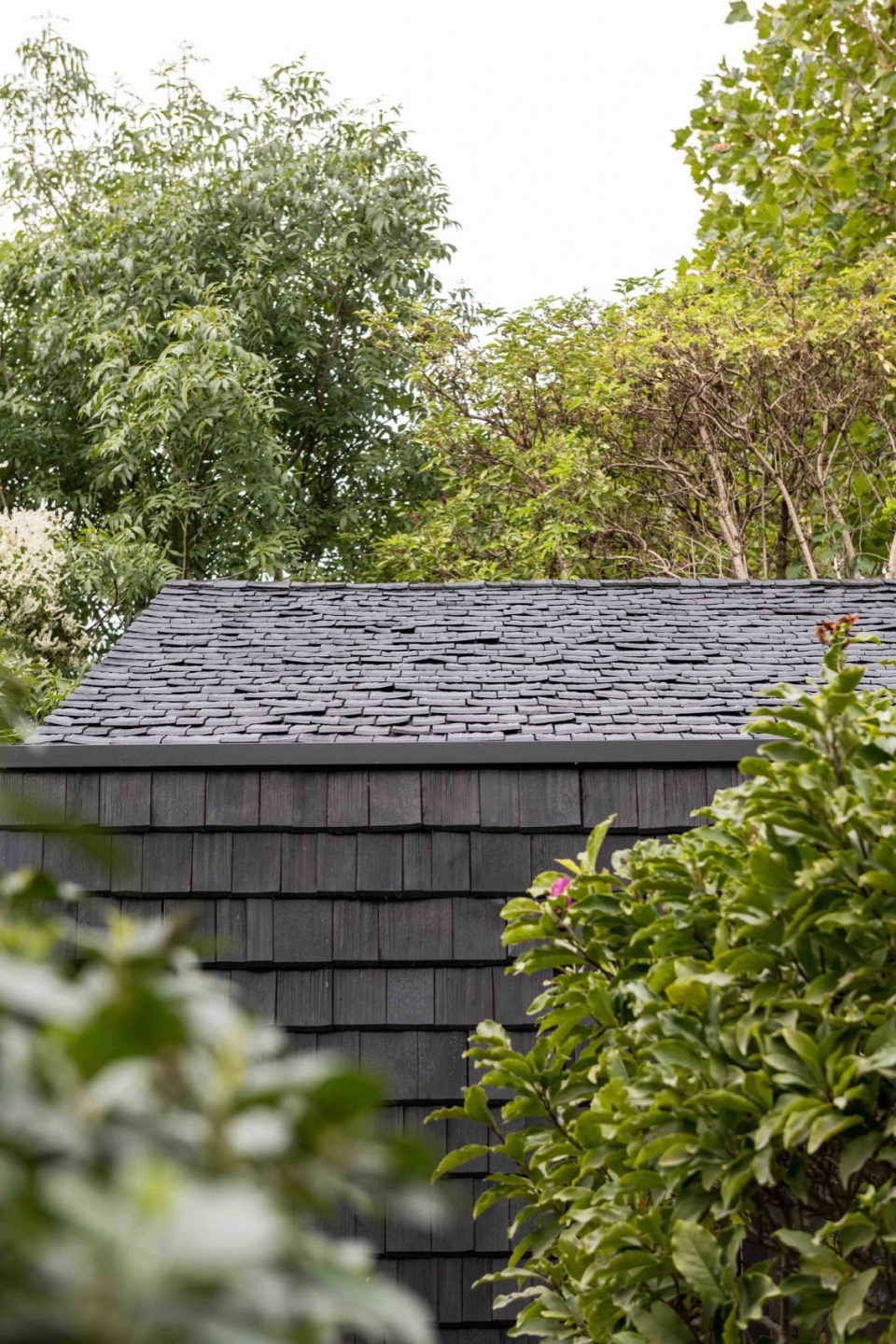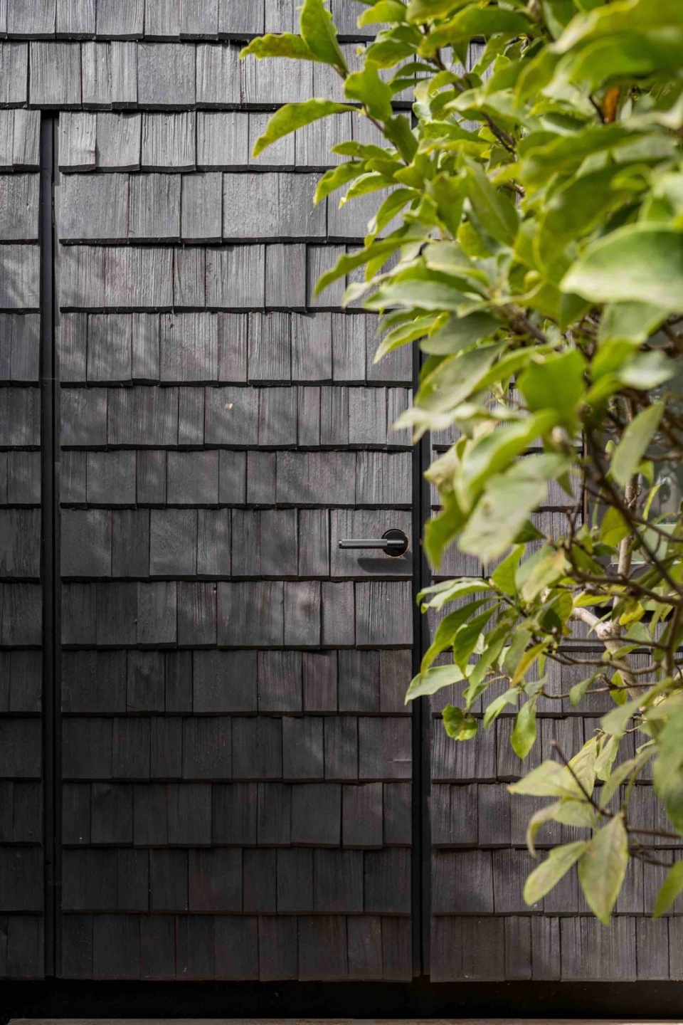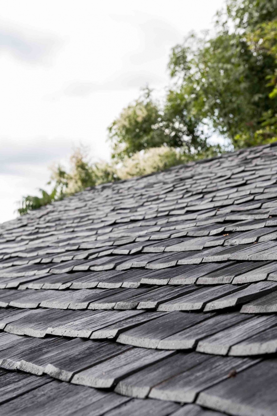 Utilising shingles to clad the walls and roof was influenced by Archer + Braun’s co-founder Sarah Braun’s exposure to the architectural vernacular of rural villages in the Alps. The shingles, a low carbon and sustainable product, were sourced from an artisan producer in Bavaria that produces shingles that are hand split and made from older larch ’shingle’ trees, creating a finish to the timber that exposes the grain and is rich in variety and texture. When experimenting with different finishes, the black matt finish eventually chosen emphasises the variation present in the surface of each shingle, and gave a typically rustic material a contemporary and unifying quality.