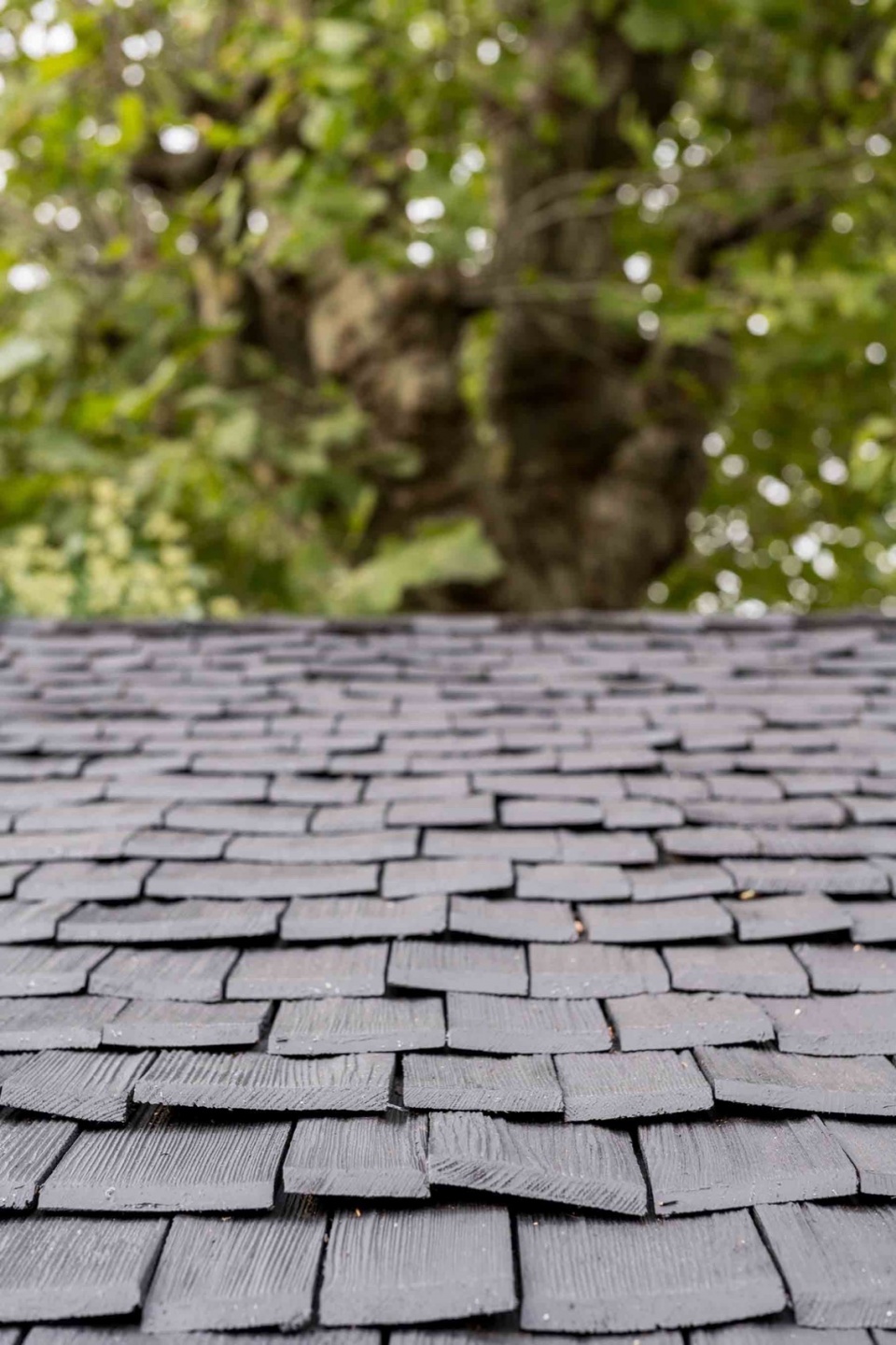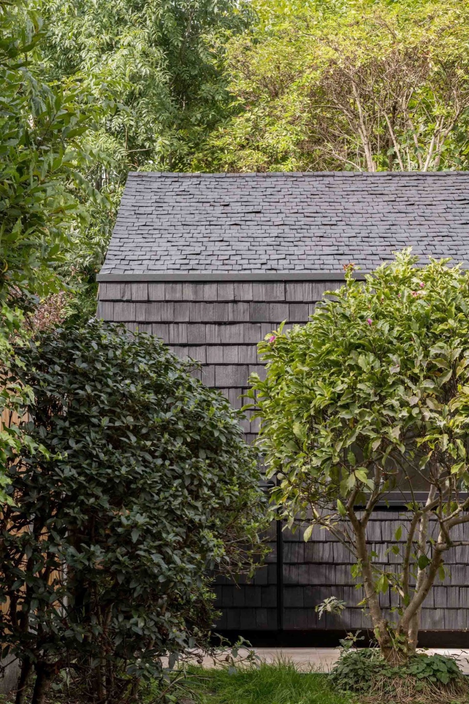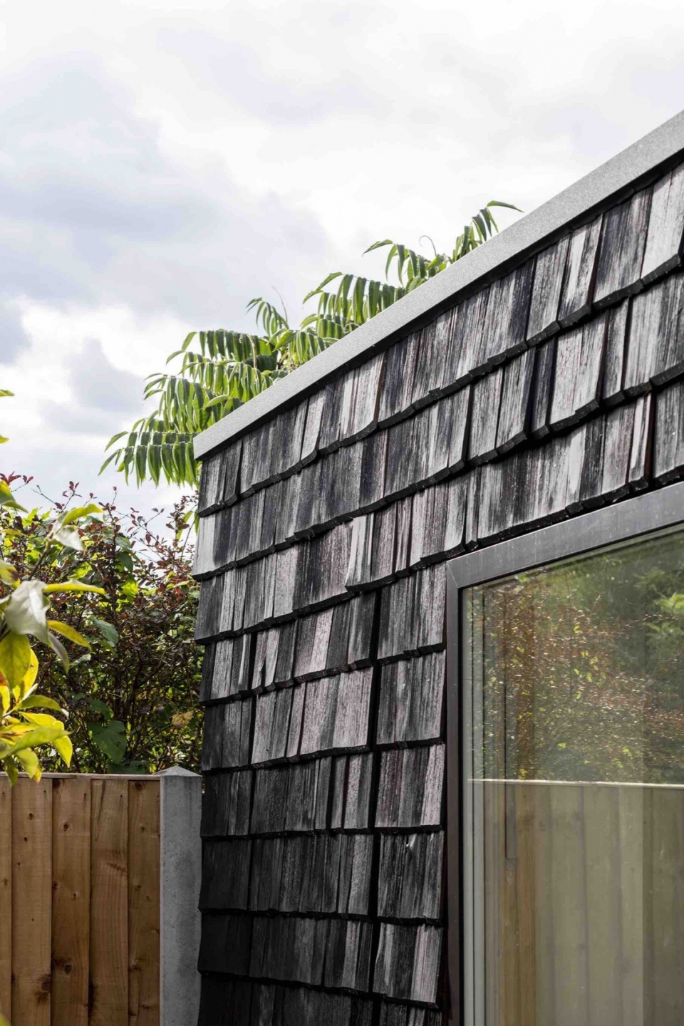 Utilising shingles to clad the walls and roof was influenced by Archer + Braun’s co-founder Sarah Braun’s exposure to the architectural vernacular of rural villages in the Alps. The shingles, a low carbon and sustainable product, were sourced from an artisan producer in Bavaria that produces shingles that are hand split and made from older larch ’shingle’ trees, creating a finish to the timber that exposes the grain and is rich in variety and texture. When experimenting with different finishes, the black matt finish eventually chosen emphasises the variation present in the surface of each shingle, and gave a typically rustic material a contemporary and unifying quality.