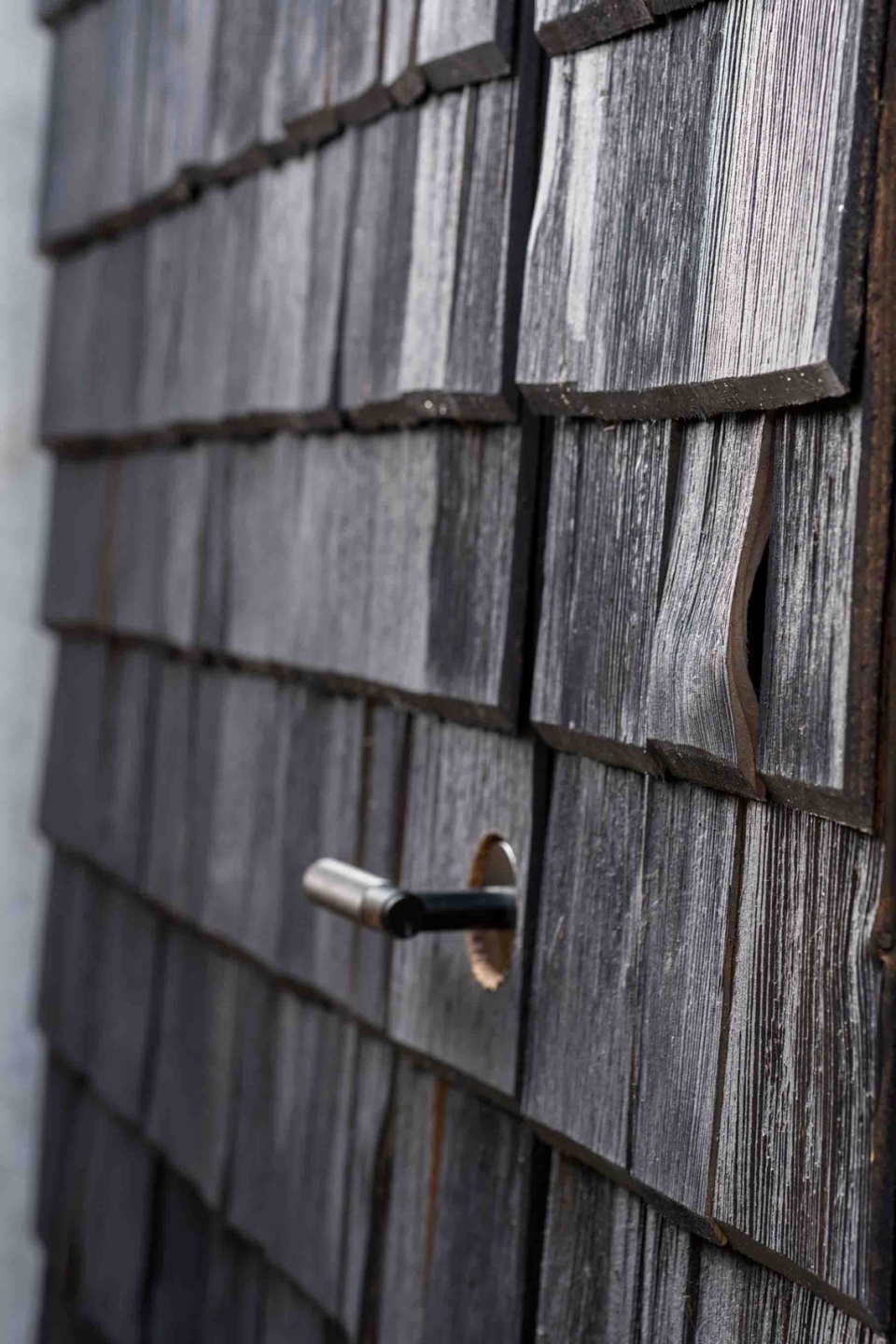 采用木瓦覆盖墙面与屋顶的设计灵感,来源于Archer + Braun事务所联合创始人Sarah Braun对阿尔卑斯山区乡村建筑语言的熟悉与记忆。这些木瓦由巴伐利亚的一位工匠供应商手工劈制而成,取材于年长的落叶松树,属低碳且可持续材料。木瓦的自然纹理在制作过程中得以充分显现,呈现出丰富多变的质感与层次。在多次尝试不同表面处理后,最终选择了哑黑色涂层,这一做法既强调了每片木瓦表面的细微差异,又赋予这种原本质朴的材料一种当代感与整体性。