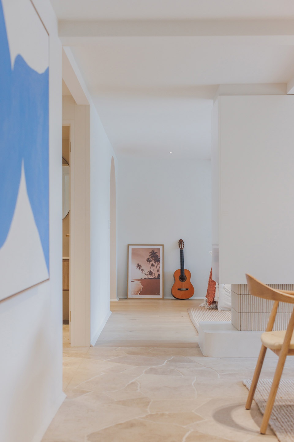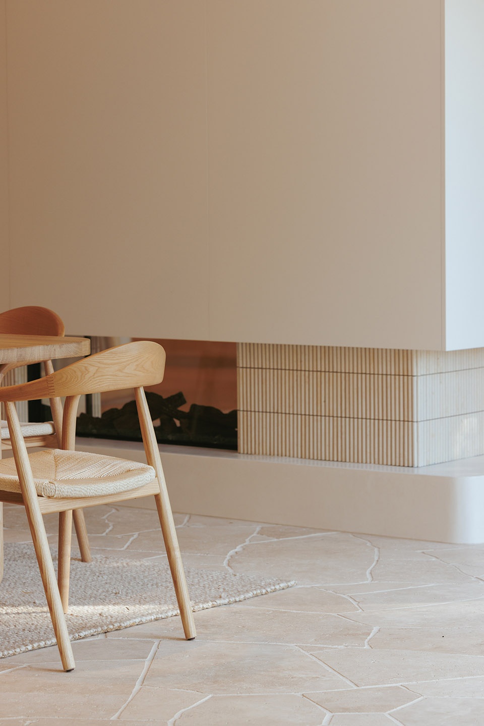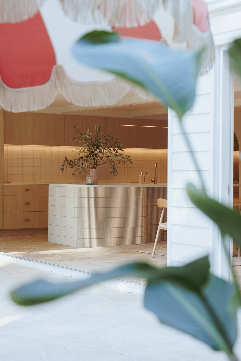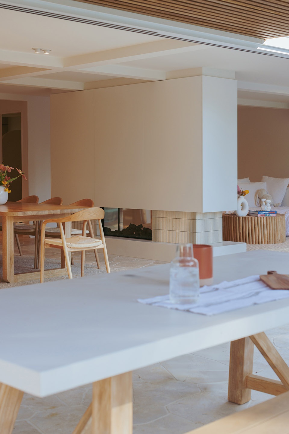 Thoughtful, elegant materials like travertine crazy pave flooring, fluted tiles, and American oak create a warm and cohesive atmosphere throughout the home. The bespoke fireplace design serves as a strong focal point, adding a touch of sophistication and providing a cozy gathering spot for the family. The incorporation of curves and soft edges in the design ensures an elegant feel and visual connection across the living areas, enhancing the overall flow and comfort of the space. Full-height glazed doors allow for a seamless transition between the indoor living spaces and the outdoor entertaining and pool areas, perfect for embracing the coastal lifestyle while providing a healthy and comfortable living environment for the family.