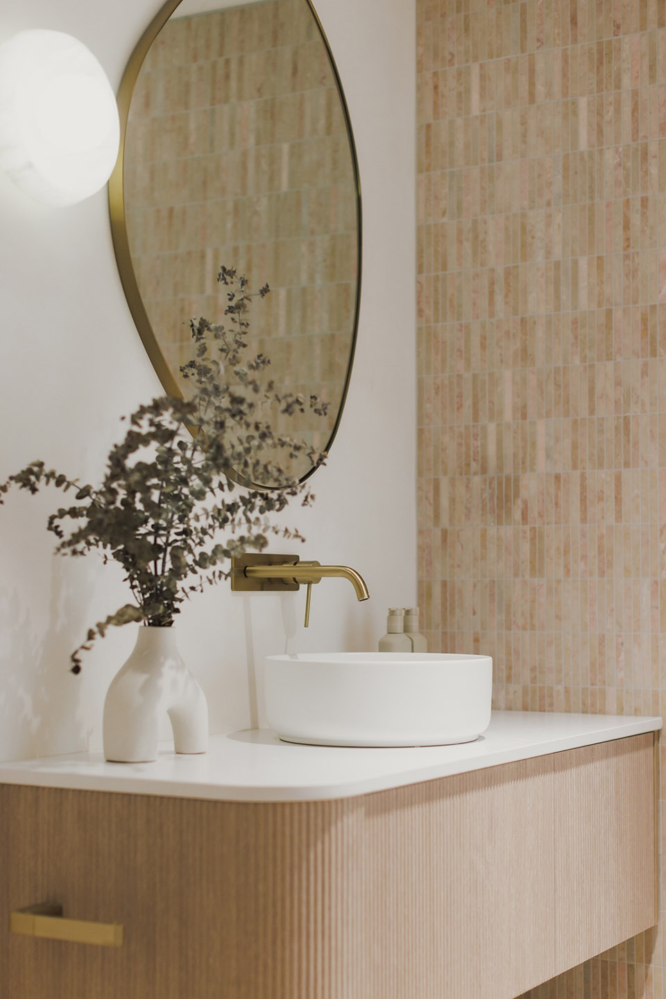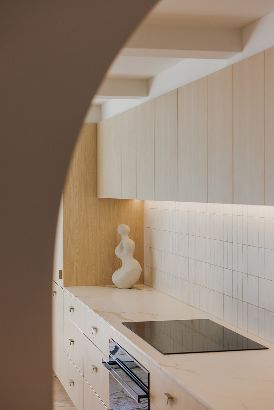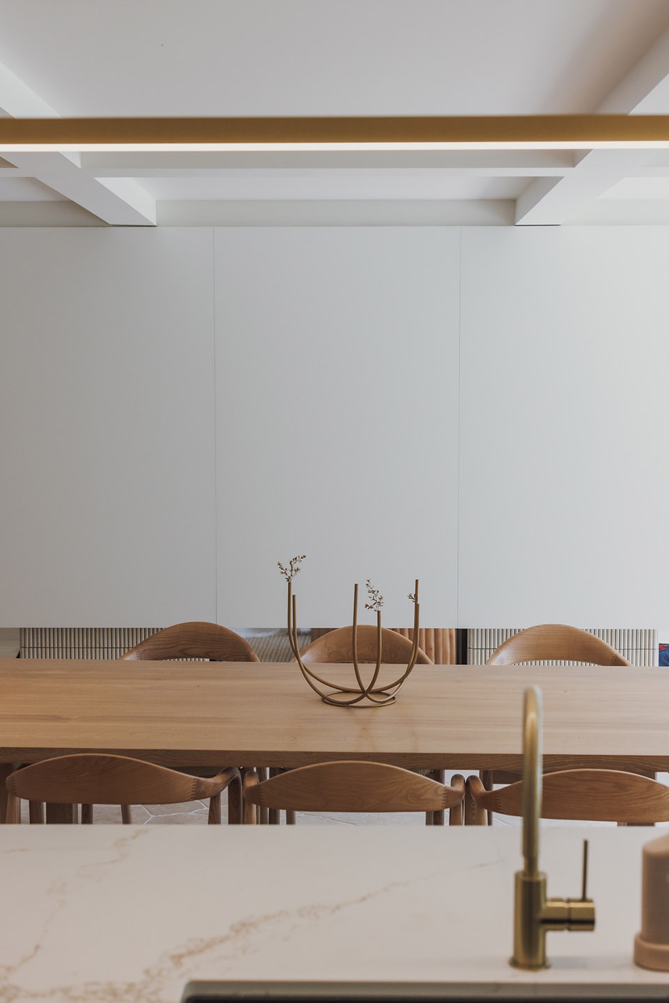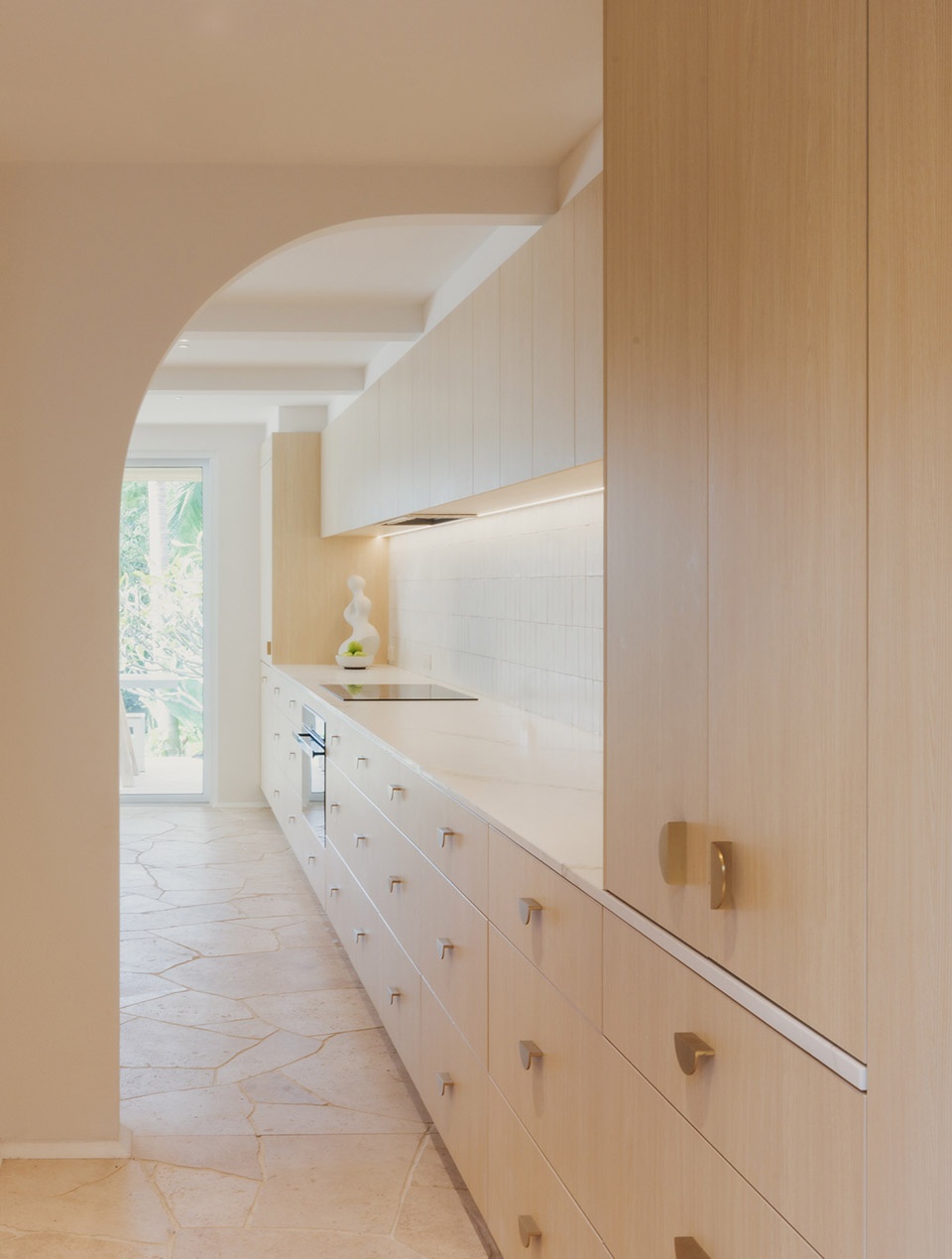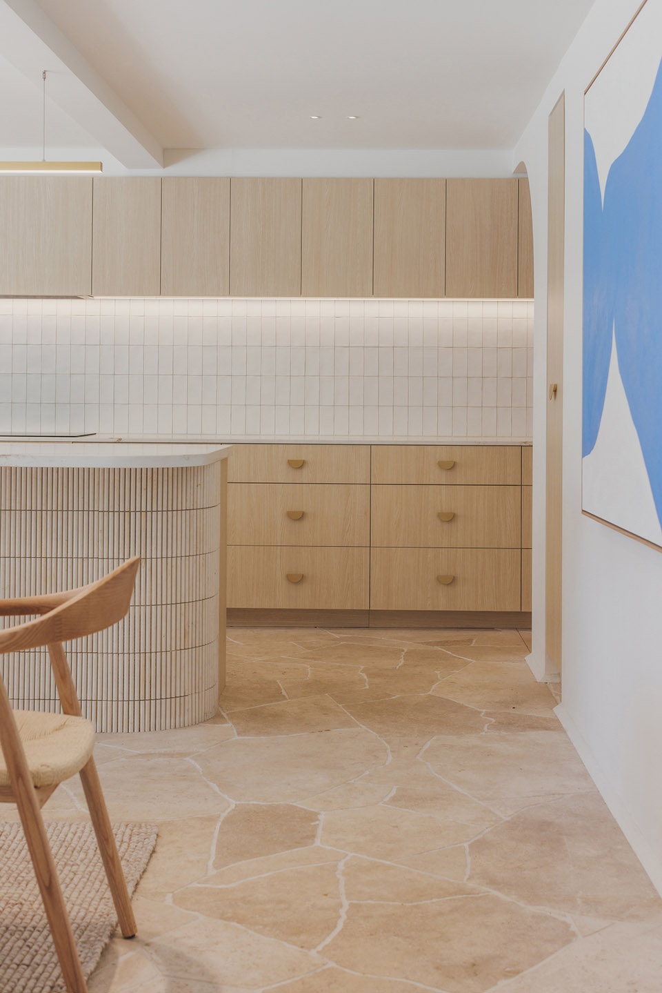 Thoughtful, elegant materials like travertine crazy pave flooring, fluted tiles, and American oak create a warm and cohesive atmosphere throughout the home. The bespoke fireplace design serves as a strong focal point, adding a touch of sophistication and providing a cozy gathering spot for the family. The incorporation of curves and soft edges in the design ensures an elegant feel and visual connection across the living areas, enhancing the overall flow and comfort of the space. Full-height glazed doors allow for a seamless transition between the indoor living spaces and the outdoor entertaining and pool areas, perfect for embracing the coastal lifestyle while providing a healthy and comfortable living environment for the family.