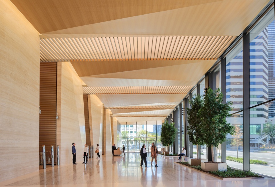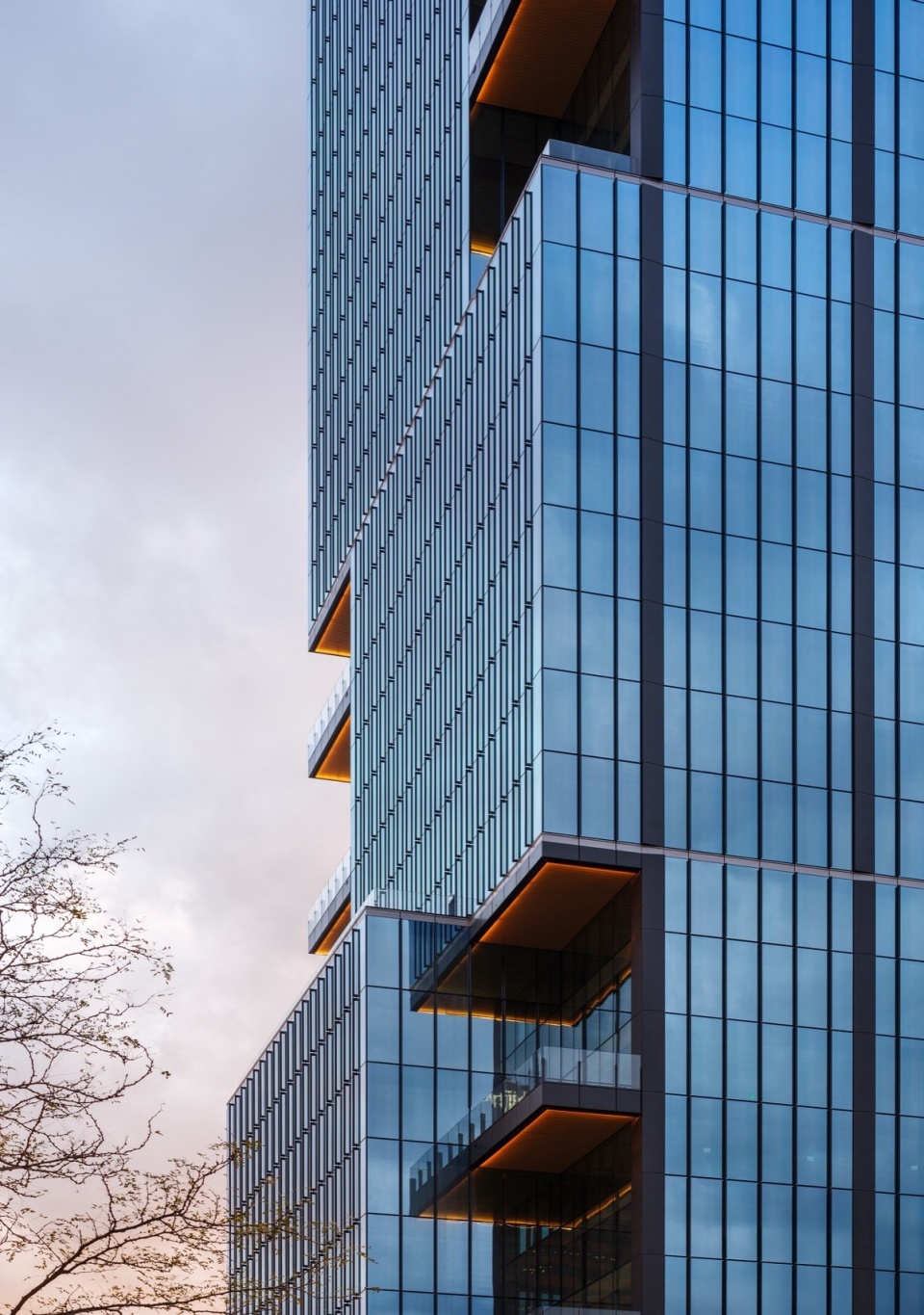 建筑外立面采用垂直立柱饰板,随着层层过渡呈现动态变化。高性能的单元式幕墙搭配悬挑式竖向遮阳构件,为立面增添了层次感,随着自然光照的变化呈现出不同的视觉效果。在首层,建筑被南侧与西侧两个活跃的公共广场环绕,广场连接至多家餐饮空间。大堂横贯整个19街街区,拥有通透玻璃立面,将户外景观自然延伸至室内。大堂内设有一面通高折线形洞石墙,成为入口处的视觉焦点,唤起人们对丹佛自然景观之美的联想。