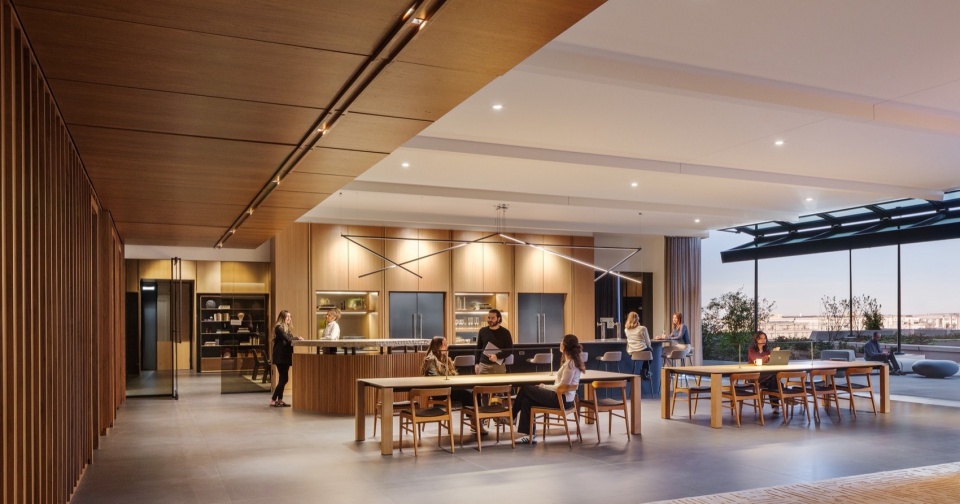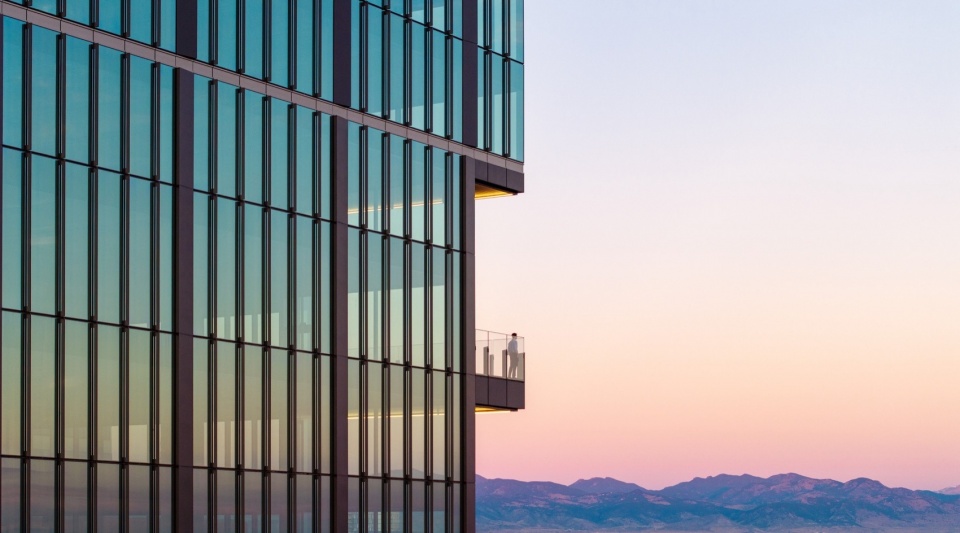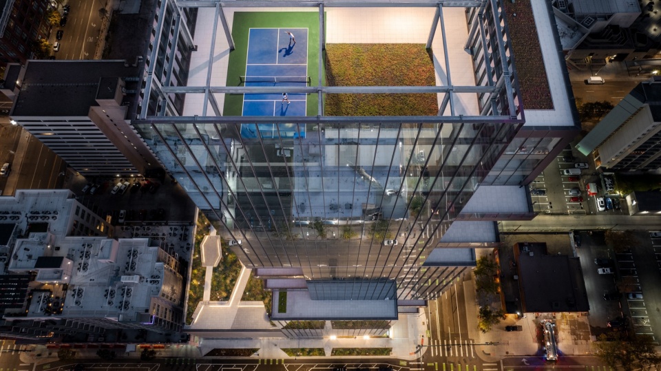 该建筑的设计采用了独特的阶梯式体量形态,促进了室内外空间的融合。体量变化营造出共11处私密租户露台,而主楼的第七层则设置了一处朝向库尔斯球场(Coors Field)与落基山脉的1万平方英尺共享露台。该露台兼为裙楼的绿色屋顶,配有丰富的景观元素、休闲座椅和开放空间,用于协作与放松。露台与其所在的配套设施层通过可开启的玻璃幕墙相连,室内设有先进健身中心、多功能会议中心、多用途董事会议室、高级休闲厅以及高尔夫模拟器。建筑的共享空间还包括屋顶活动平台,其中设有全球最高的户外匹克球场,并可享受360度城市全景。