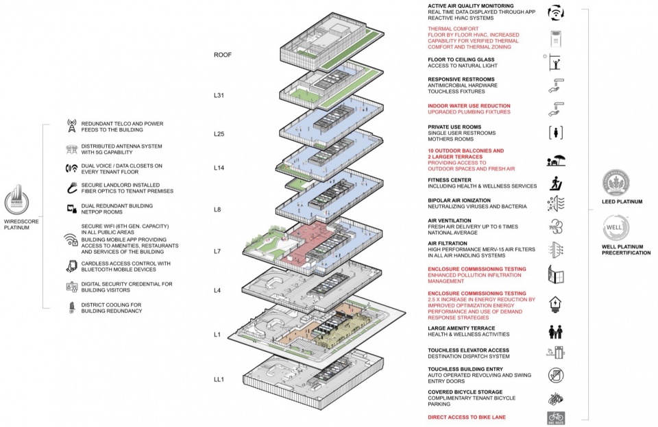 1900 Lawrence在设计上充分考虑最新科技、可持续发展与健康福祉标准,采用了高风量新风系统、先进的空气过滤设备与专用排气系统,防止楼层间空气交叉流动,确保室内空气质量最优化。项目还配备了目的地控制电梯系统、无摩擦式通行控制与5G 连接网络。其健康计划还包括一个由专业团队管理的健身中心,提供团体课程与私人训练服务。