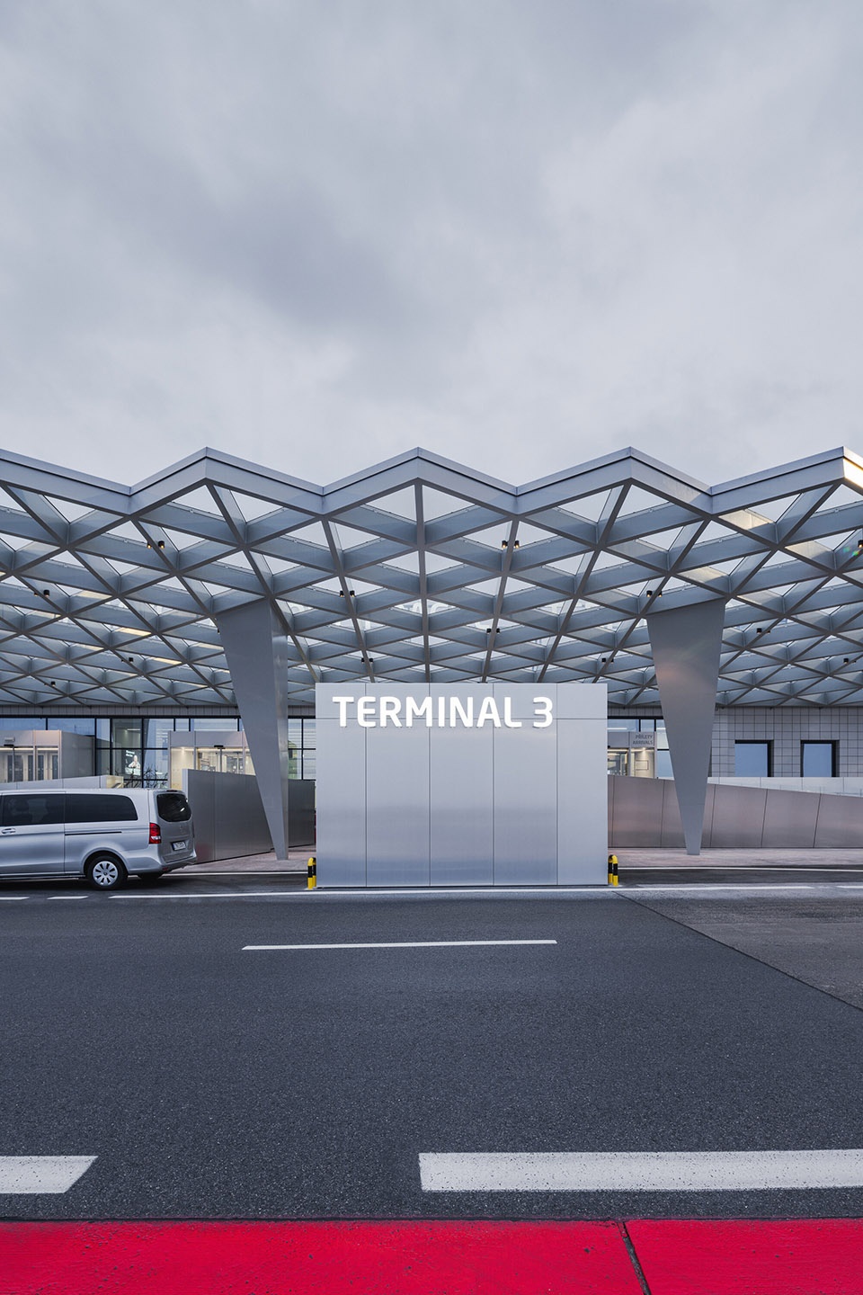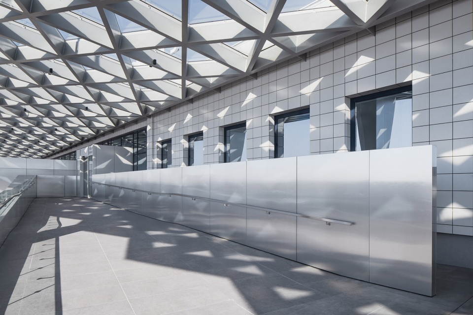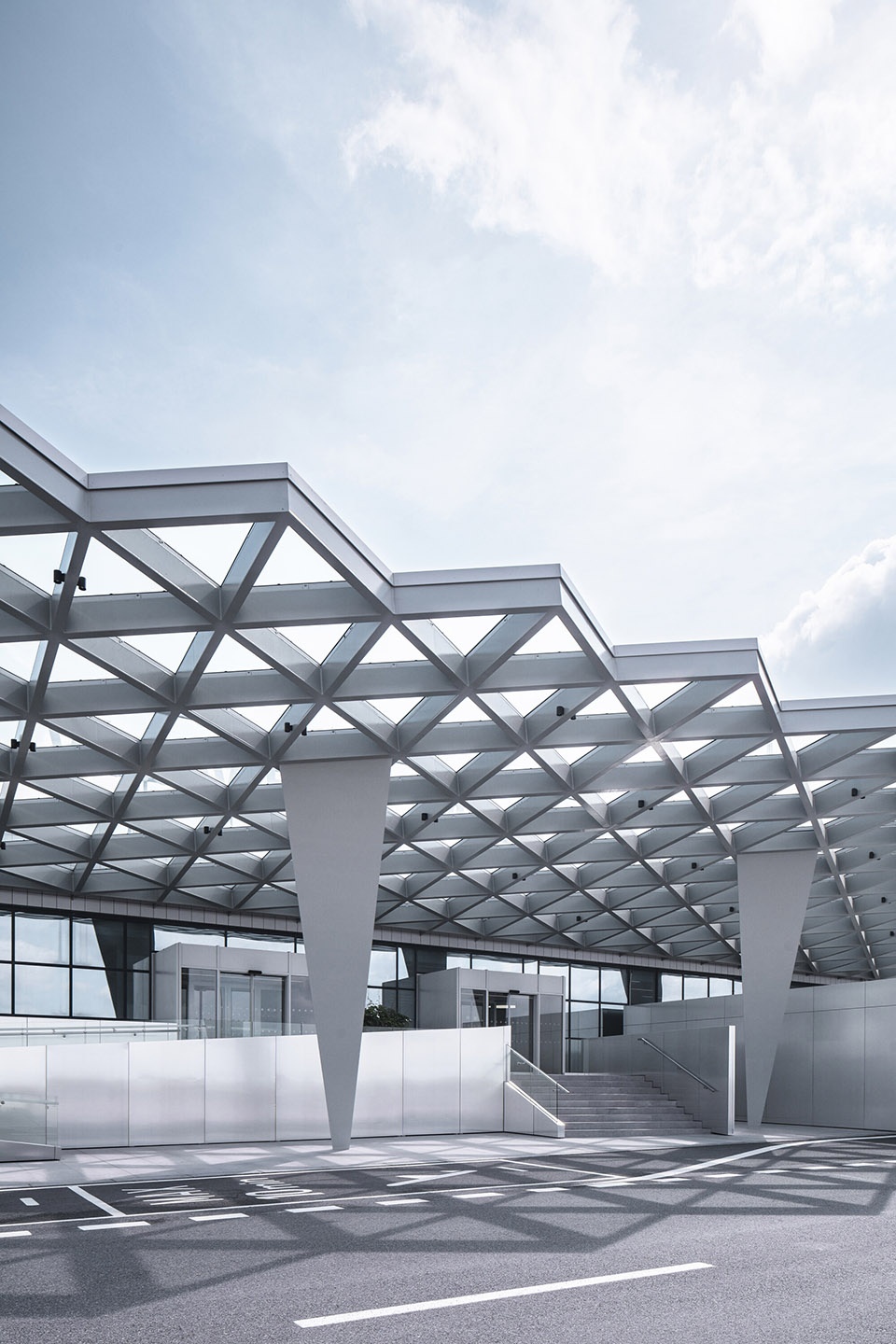 在空侧部分,引入了一项显眼的新建筑元素——一座钢结构雨棚,其由等边三角形构成的“蛛网状”结构尤为醒目,支撑结构为七根截顶金字塔形的柱子。这一几何语言也延续到了新建的楼梯和坡道上,采用拉丝金属包裹,构成一幅优雅而具有标志性的剪影,从远处即可辨识。为了满足运营动线分离的需要,设计还引入了独立的出入口,分别服务于贵宾旅客、旅游团、抵达与出发乘客,以确保动线通畅与安全。