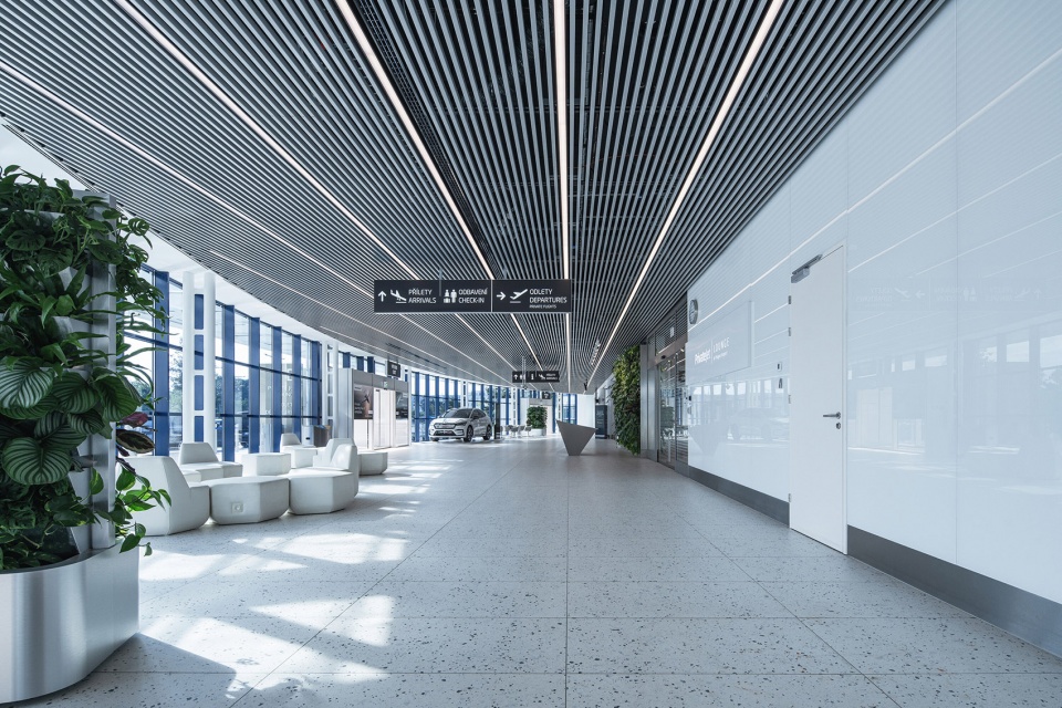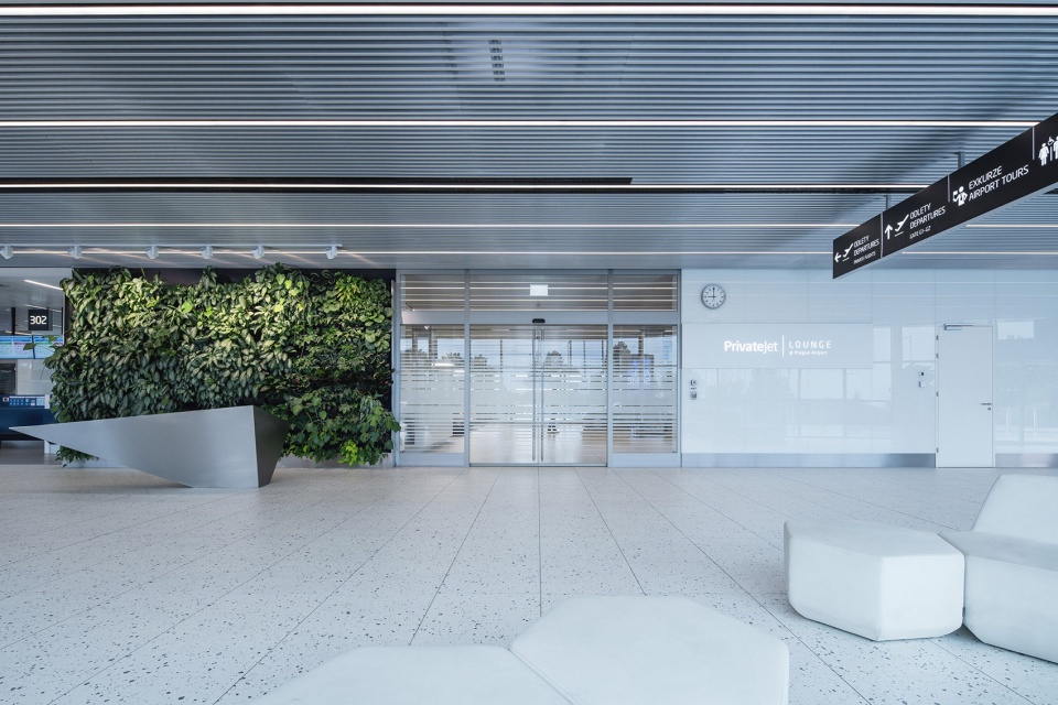 室内设计概念以“简约”与“庄重”为核心。选材上运用了拉丝金属、玻璃及贵宾区的装饰元素,突出了航站楼作为形象展示空间的功能。贵宾休息室配备玻璃包裹的柱体和定制家具;普通候机区则遵循布拉格机场既有的设计标准。通过垂直绿植墙和独立绿植器实现的植被融合,为空间增添了一份宁静与格调。专设的礼宾接待室内饰有捷克狮子徽章图案,为正式访问提供了庄重的环境。