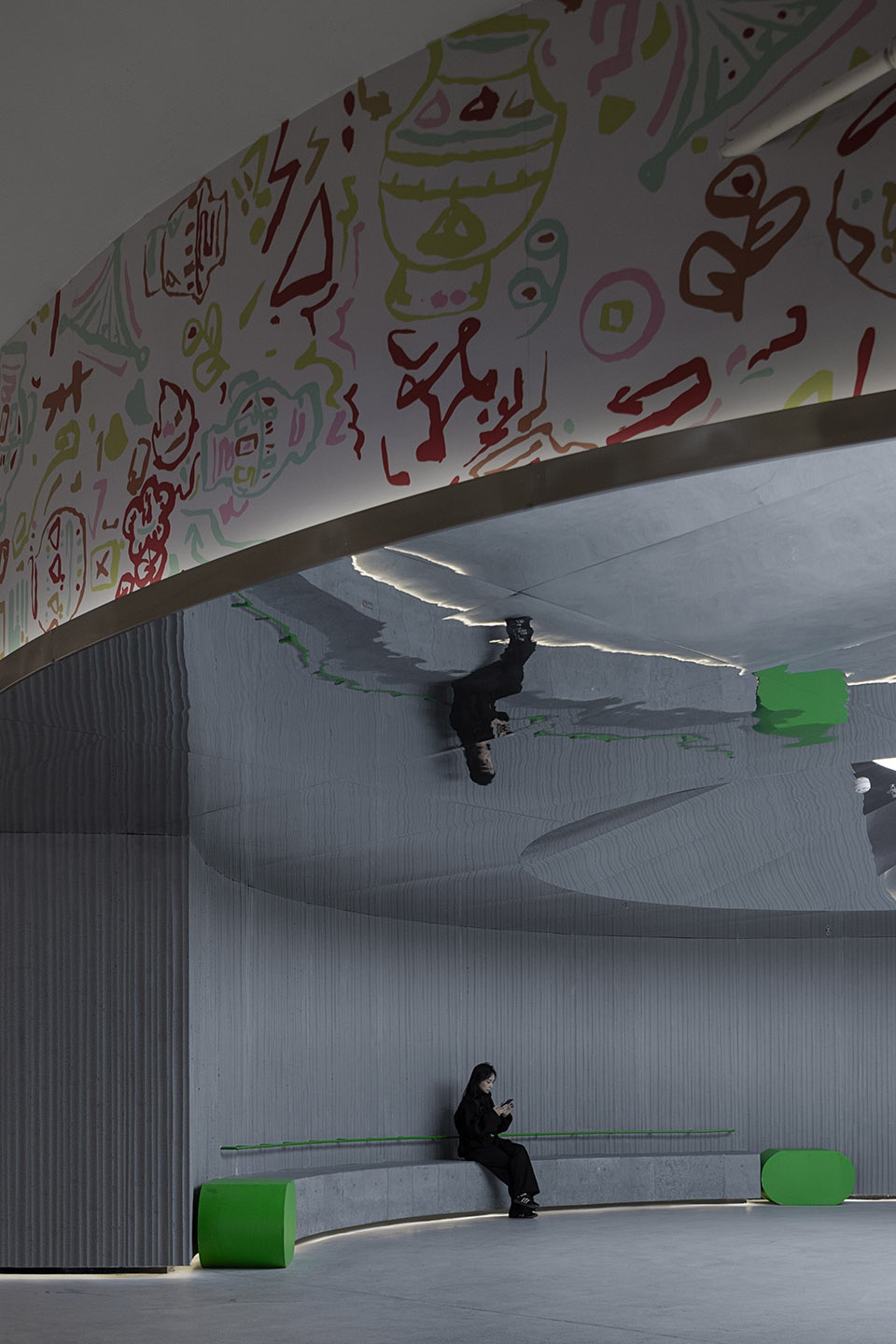 Sunlight penetrates the domed roof, scattering a secret code of dappled light across the bluestone steps; gentle breezes carry the fresh scent of greenery, composing a silent rhythm along the corridors. Here, the cacophony and neon lights of traditional commercial districts are left behind. Instead, native stone, natural wood grilles, and vertical greenery form a “breathable space.” The sunken courtyard draws daylight underground, where moss-covered walls reveal the texture of time in the shadows, and water features mirror the ever-changing sky above. The designer uses the “grammar of nature” to reshape the space, making every corner a contemplative retreat reminiscent of Thoreau’s Walden.