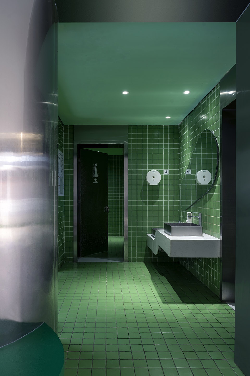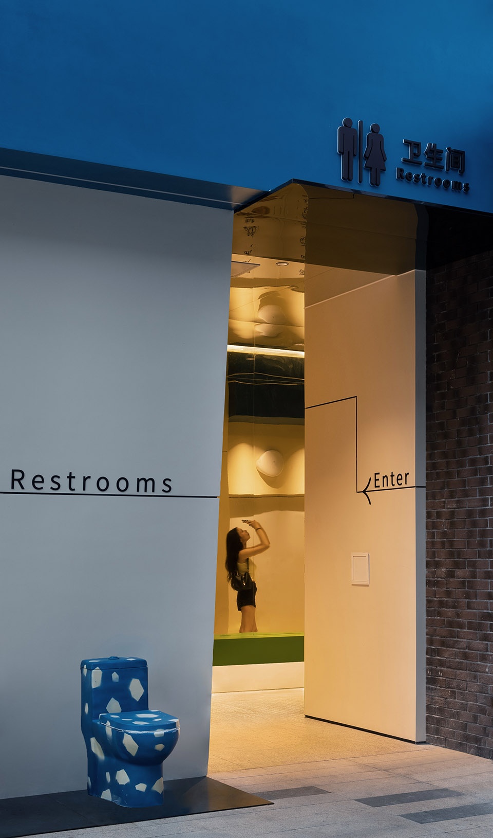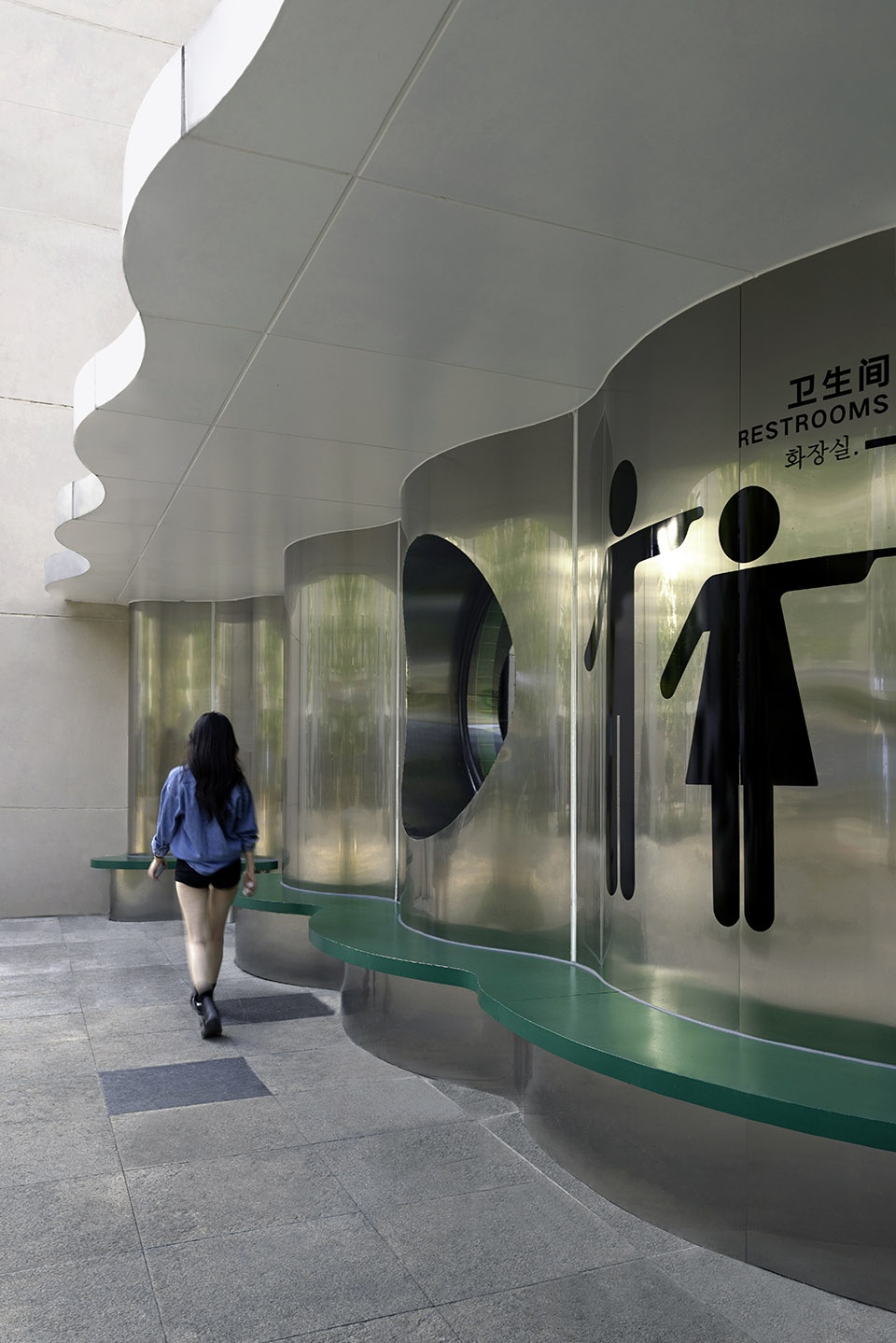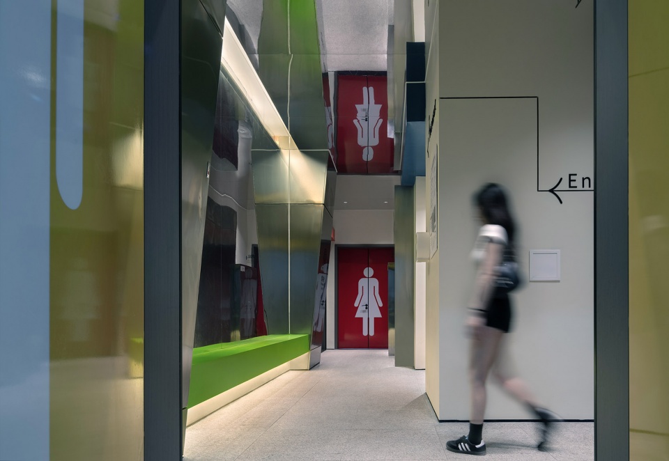 In the public restroom on the west side of the cultural and creative district, a dedicated makeup area is provided for women—one space opens to the view outside the window, while the other reflects one’s own image in the mirror, surrounded by greenery. The curved waiting area outside invites people to pause and rest, with indoor and outdoor spaces flowing seamlessly and comfortably together. The public restroom on the east side of the cultural and creative district features a vibrant primary color scheme and striking hues in the entrance area, making a strong visual impression. The installations at the entrance are charming and playful. The changing color palettes of the east and west restrooms offer people a distinct “dopamine color” experience as they pause in the space.