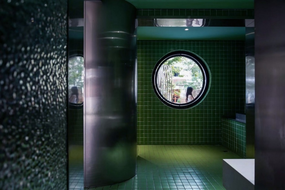 文创街区西侧的公共卫生间内为女生设置了独立化妆区域,一处是窗外一处是镜中的自己,窗外绿树掩映。外侧的等候区曲线变化让人可以驻足休息,室内和室外的空间连续又惬意。文创街区东侧的公共卫生间,入口公共区域的三原色搭配和鲜明的色彩让人眼前一亮,入口的装置可爱有趣。东西卫生间的色彩变化让驻足的人们有着不一样的多巴胺色彩体验。