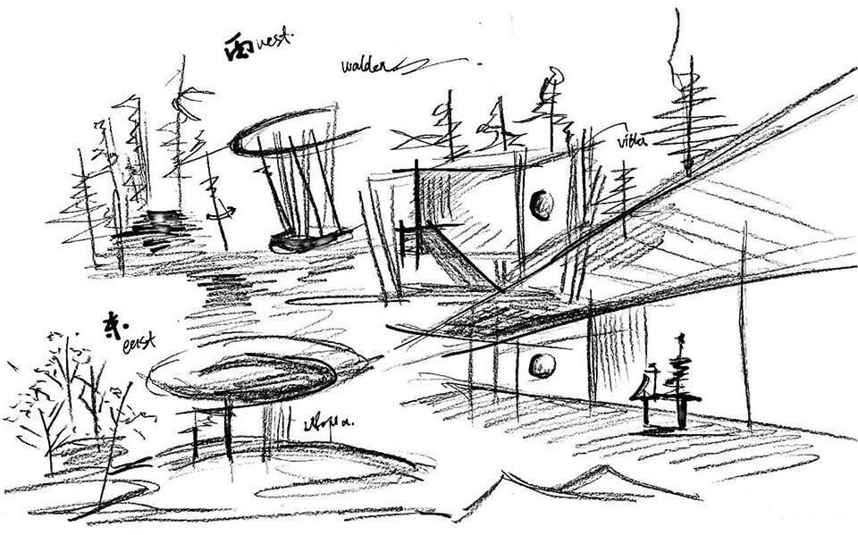 设计师以 “东西合璧” 为线索,将东方的隐逸情怀与西方的自然哲学串联。从桃花源到瓦尔登湖的体验过程让人们沉浸在自然丰富的场景氛围种,塑造一种抽象的自然元素和情景转化。