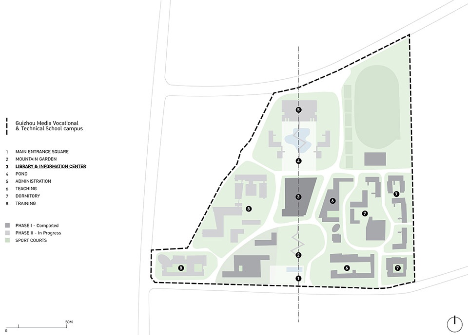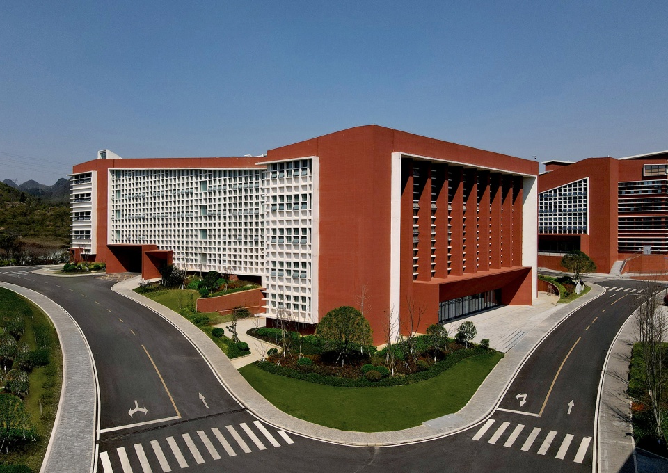 Located in Qingzhen, an up and coming district west of Guiyang, the capital city of Guizhou province, the Library and Information Center is placed at the heart of the Guizhou Media Vocational and Technical School, a 20 hectares campus to be completed in 2026. The district of Qingzhen has an important educational legacy, dating back to the early 1900, when the area witnessed the flourishing of church-run schools, which helped broadening the access to education. To honor this unique legacy, the architects played with heights and natural light, filtered through colored glasses and iconic skylights, to recreate a meditative but grand atmosphere, almost spiritual, a reference to those churches which constitute such a meaningful chapter of regional history.