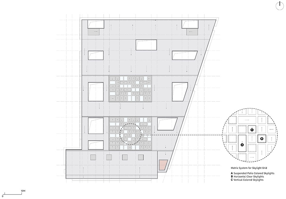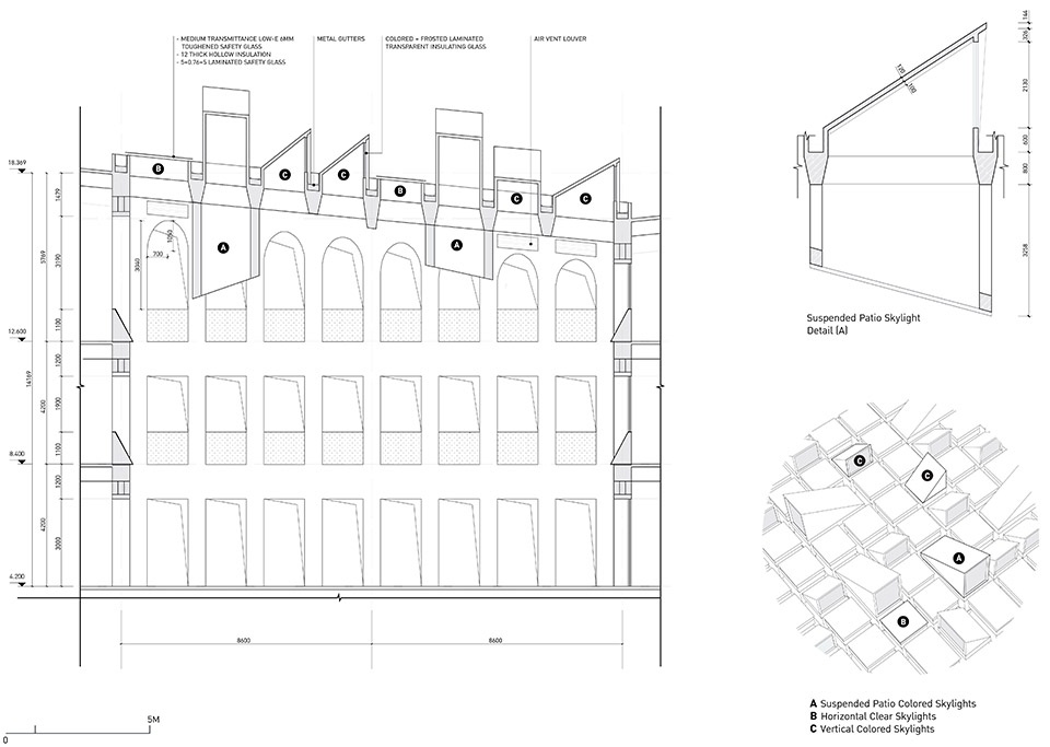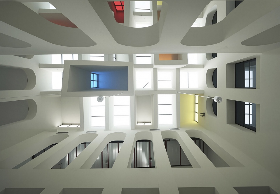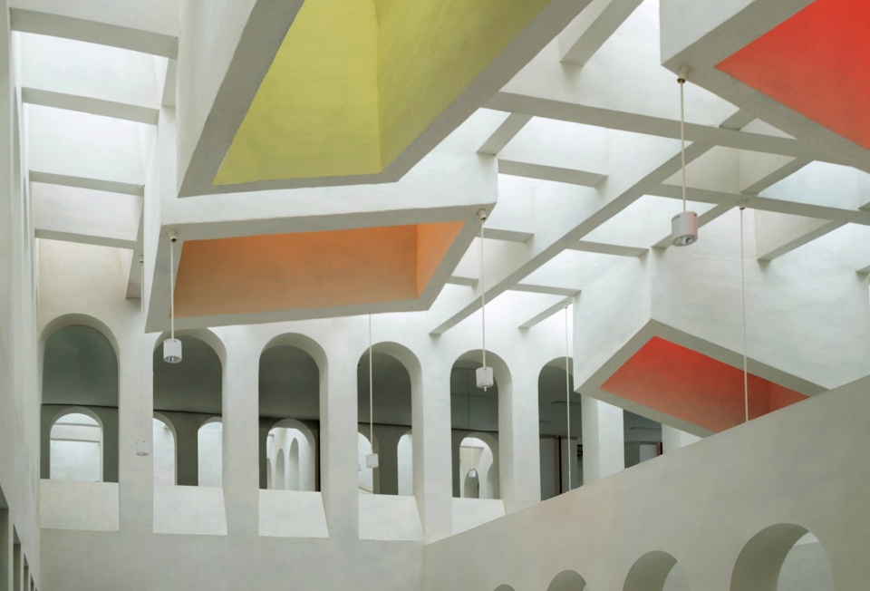 一簇簇天井状的光井自屋顶垂落于不同高度,带有雕塑感的天窗将柔和的彩色光线引入室内,照亮阅读与学习空间。中国文化中,颜色具有特殊的象征意义,建筑师选用红、黄、蓝三色,直接引用了道家五行哲学的元素观:红色代表“火”,象征生命力;蓝色代表“木”,象征智慧;黄色代表“土”,象征神圣。此外,天窗通过不同角度洒下的光线,也赋予空间戏剧性的氛围,仿佛舞台灯光,隐喻该校作为区域广播影视传媒教育中心的核心角色。