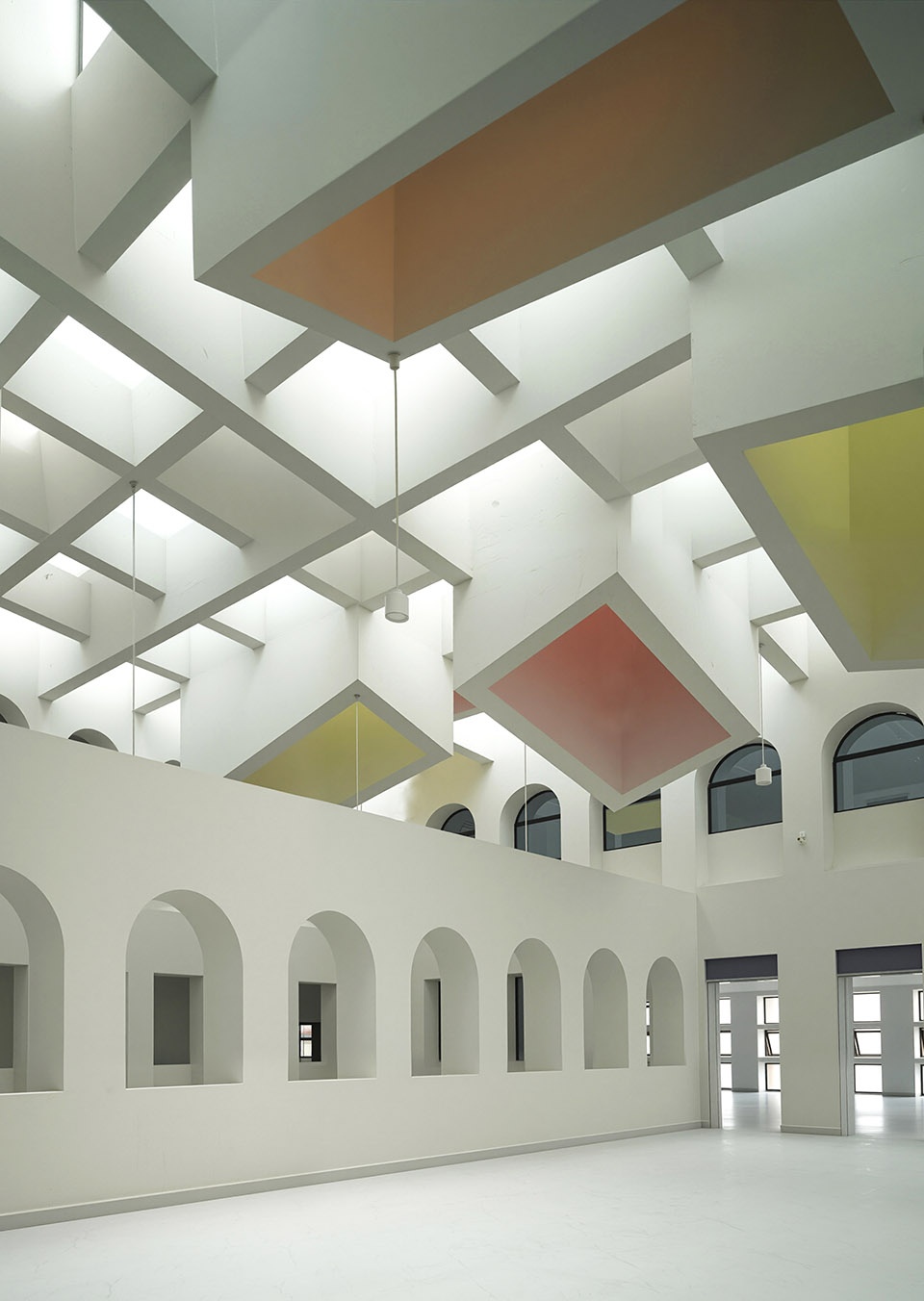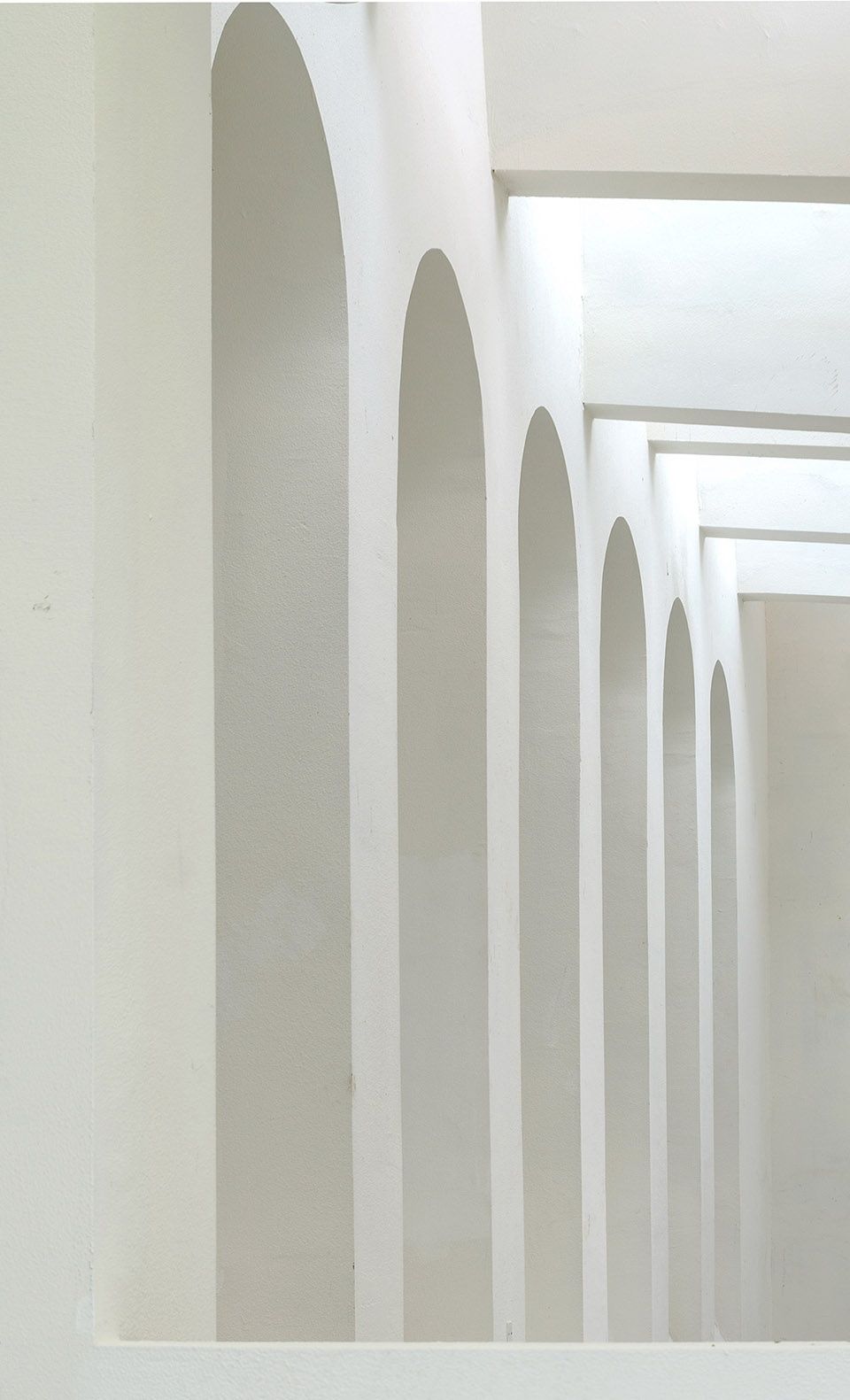 The interior space is also strongly punctuated by layered arched openings, sometimes running parallel, other enclosing inner spaces, which create a rich spatial network of overlapping sightlines and shifting perspectives. These repetitive openings create a sense of openness and collectivity, while encouraging moments of quiet reflection.