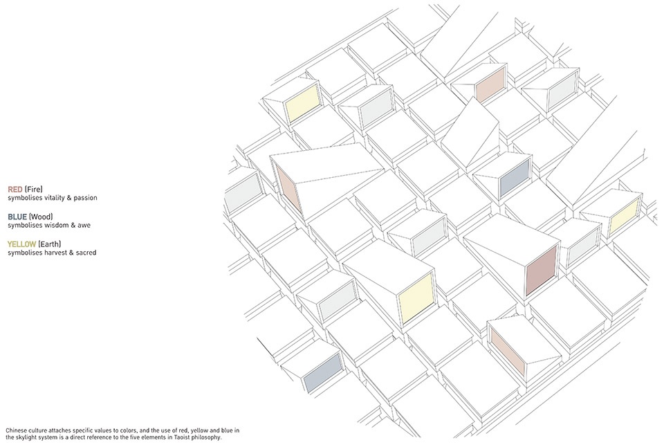 These sculptural skylights diffuse a gentle, colored light that enhances reading and study areas. Chinese culture attaches specific values to colors, and the architects’ use of red, yellow and blue is a direct reference to the five elements in Taoist philosophy. One way the elements can be expressed in space is through the use of color, where red (fire) symbolizes vitality, blue (wood) wisdom and yellow (earth) the sacred. Furthermore, by spreading the light at different angles, the skylights bring a theatrical quality to the space, reminiscent of stage lighting, a subtle reminder to the campus’ role as the main center for broadcasting film and media education in the region.