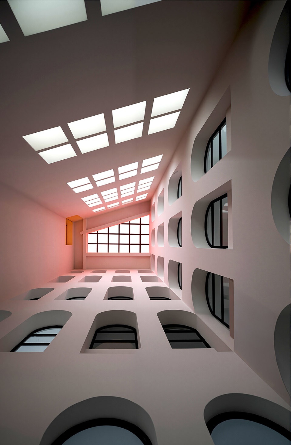 ▼带有雕塑感的天窗将柔和的彩色光线引入室内,these sculptural skylights diffuse a gentle, colored light