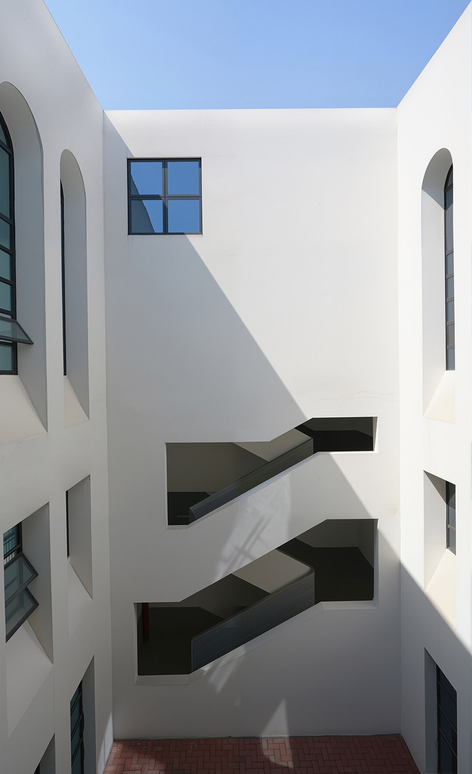 室内空间还通过层层叠叠的拱形开口进行节奏化表达,或平行布置,或围合出内向空间,构建出一个丰富的视线交织系统与不断变化的空间感知。重复的拱形元素既带来通透开放的体验,也营造出群体共享与静谧沉思共存的氛围。