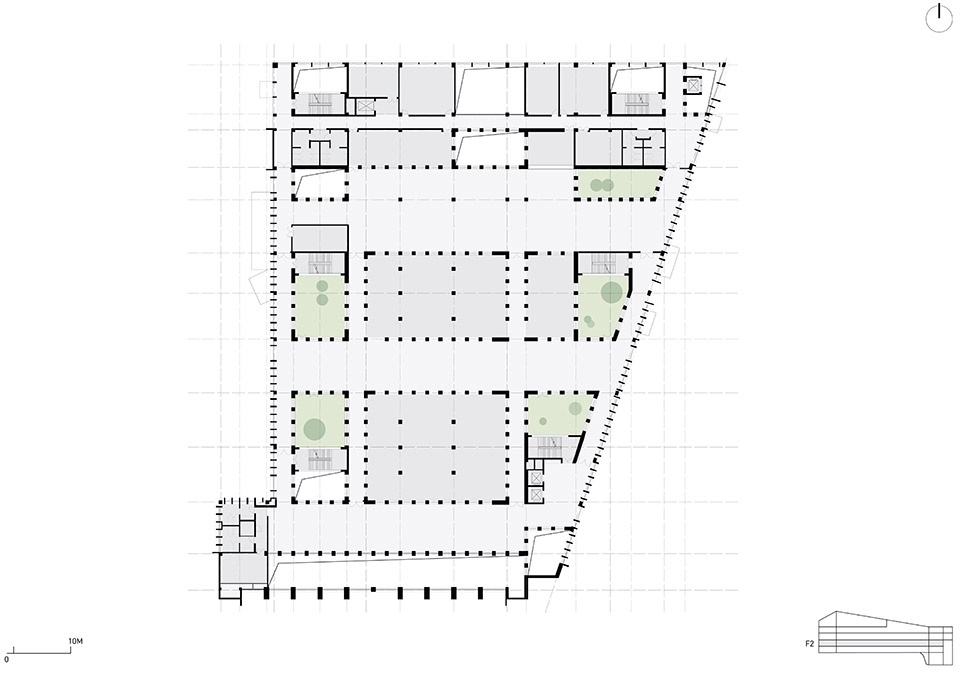 与厚重外观形成鲜明对比的是通透明亮、宛如大教堂般的室内空间,其设计逻辑基于矩阵式网格系统。建筑内部穿插着一系列庭院空间,这是对区域传统“院中院”空间类型的当代表达,亦唤起了古代书院的空间意象。这些对原始体量的“减法”操作有助于引入自然采光与通风。建筑师在设计过程中,细致观察本地传统建筑,以全新视角重新演绎,意识到特定空间格局所承载的诗意,能够激发学习氛围并延续文化传承。