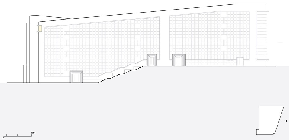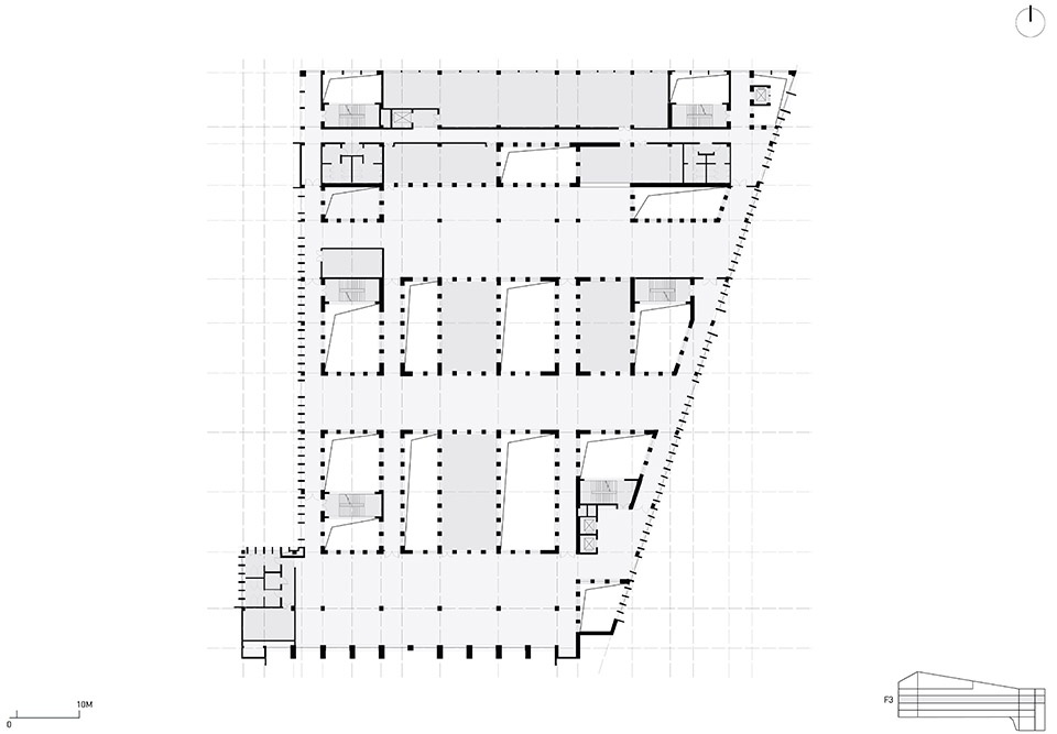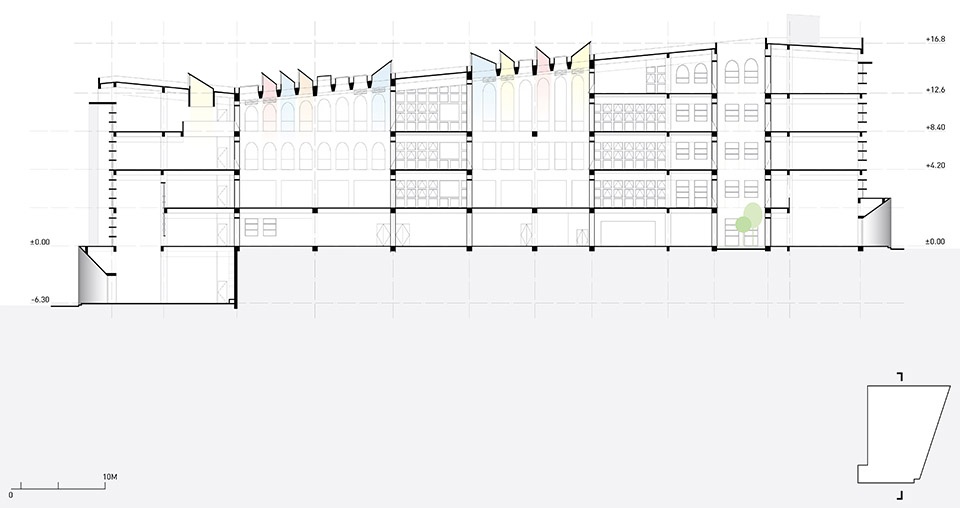 The five-story building covers a total floor area of approximately 18,876 square meters, is designed on a south-north axes, following the site’s natural slope, and is composed of two primary volumes. The student library at the southern end acts as a proper visual threshold, marking the transition from the open campus, while the northernmost volume follows the terrain, enclosing a series of courtyards and housing offices and studios. Progressing from south to north, from openness to enclosure, the two volumes constitute the core of the campus, its ceremonial and intellectual heart.