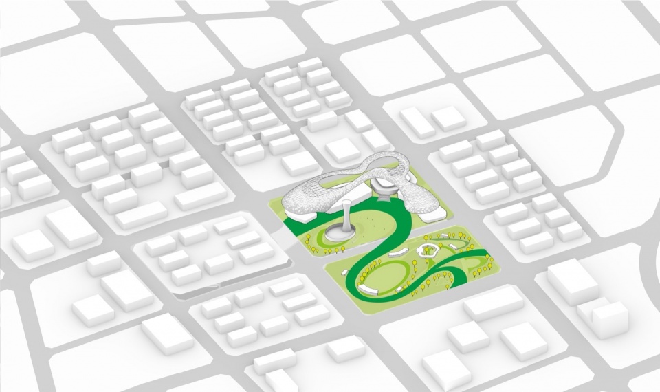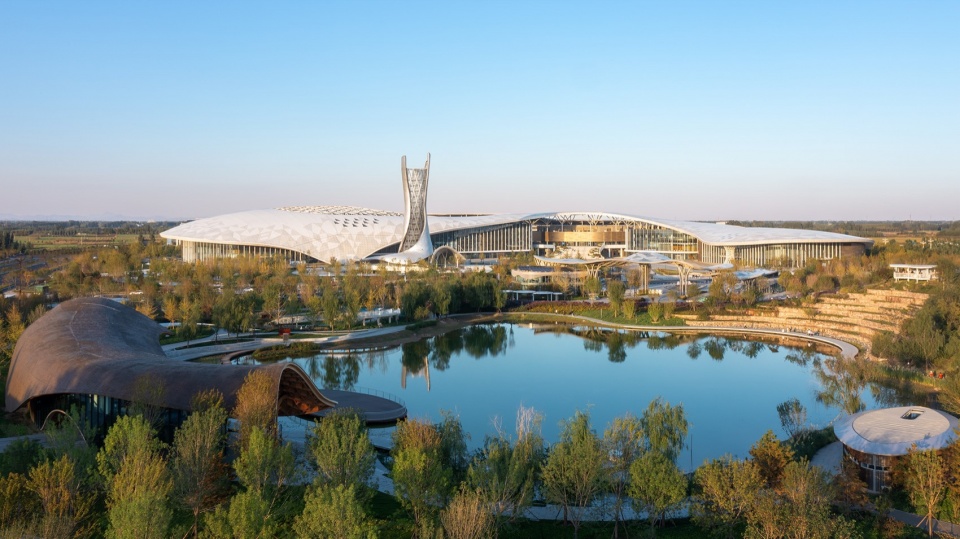 定州文体中心总用地面积14.05公顷,总建筑面积13.64万平方米,包含五大核心建筑单体:剧场、文化中心、体育馆、全民健身中心和会展中心,并配以园博塔、下沉庭院等附属场所。项目设计充分考虑了民众参与式设计、低碳环保、极端气候、智能建造等现代理念,致力于通过生态与科技的结合,提升城市的公共活力。
