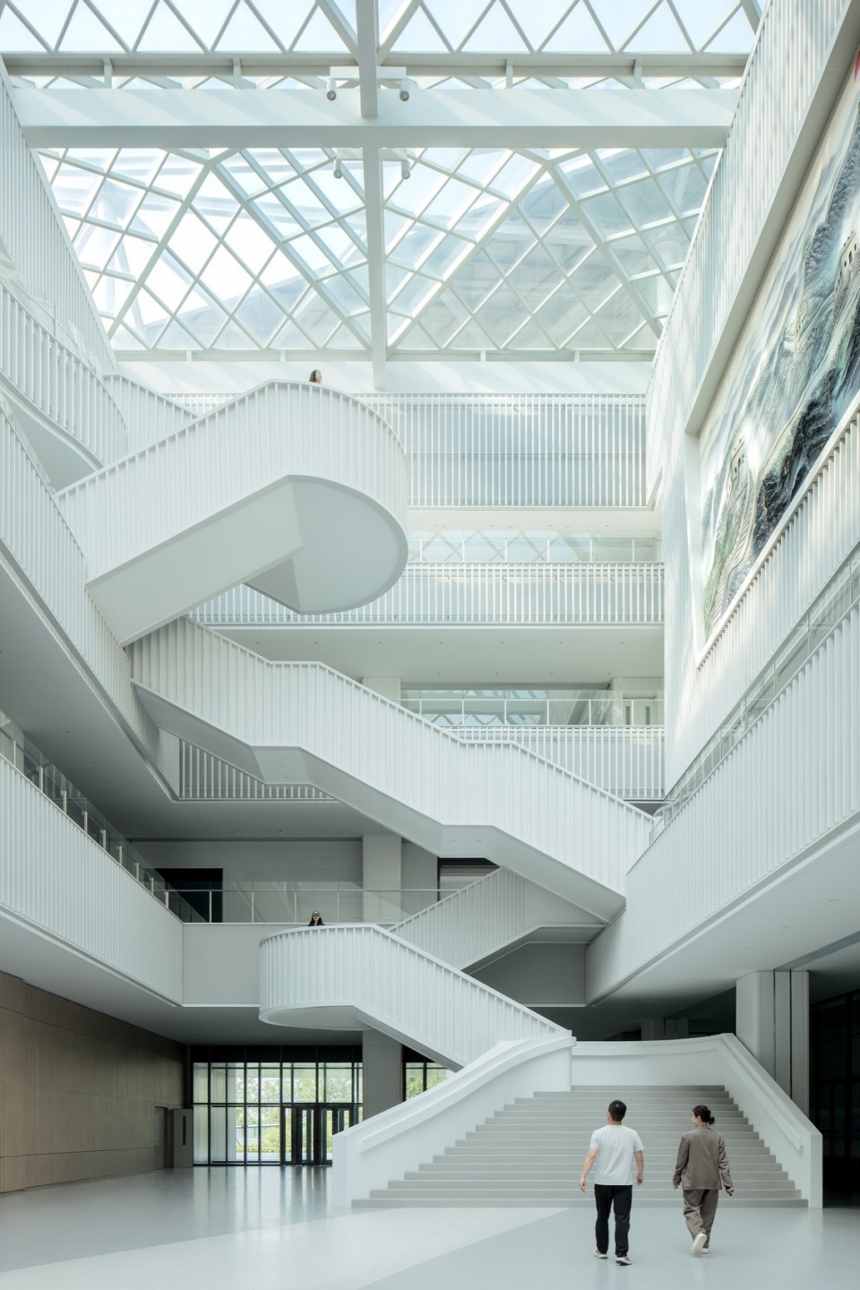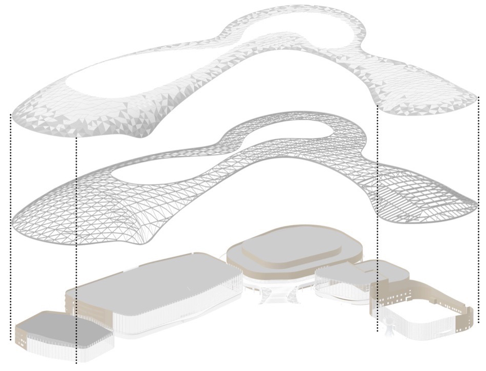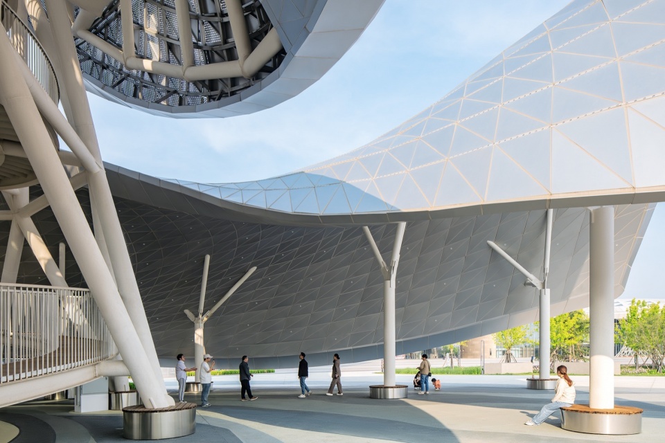 参数化渐变的游云屋面和二层跨越室内外的连通空间,将五个场馆串联成一个整体,营造出多层次、多尺度、多功能的城市空间,鼓励人们在非消费空间中自由穿梭,重构公共生活。树形钢柱支撑的大跨平面网格结构,轻盈的屋面铝板和铝拉网吊顶通过参数化变化的色彩与镂空率,形成自然有机的肌理感,致敬千年定州白瓷的质感。园博塔作为项目的制高点,不仅提供了登高远眺的绝佳视角,还将视线引向定州古城的开元寺塔,古今交相辉映,创造出漫游休憩的新体验。