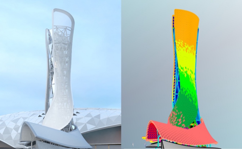 项目注重智能设计、智能生产与智能施工。采用参数化设计对异形曲面的三角分形和穿孔率梯度变化进行建模,实现了幕墙单元板块的精确划分与优化排布,以数字工匠达成人机协同,并联动智能施工。施工过程中,异形钢构和会展中心大跨单层张弦梁结构通过BIM和MADAS技术进行模拟与数控切割,确保了施工的高效与精准。此外,项目采用太阳能和空气源热泵等可再生能源,供给超过 80%的生活热水和泳池热水,比使用天然气每年可减少约22.41吨的碳排放。使用节能灯具,每年可以减少约204.99吨碳排放。基地绿化面积约46459㎡,每年减碳约166.83吨。