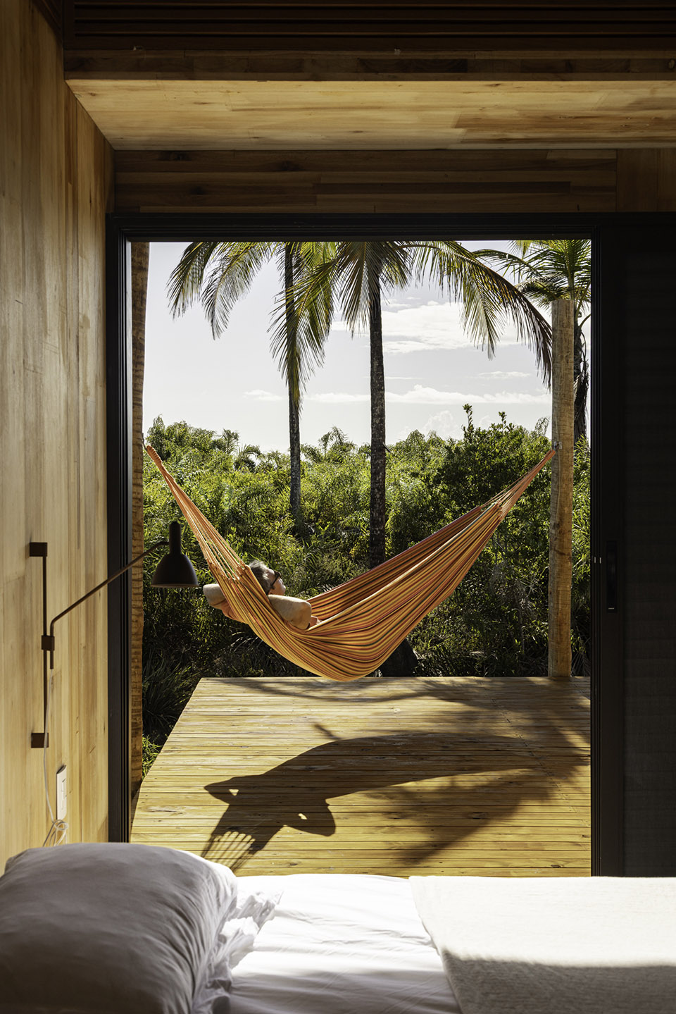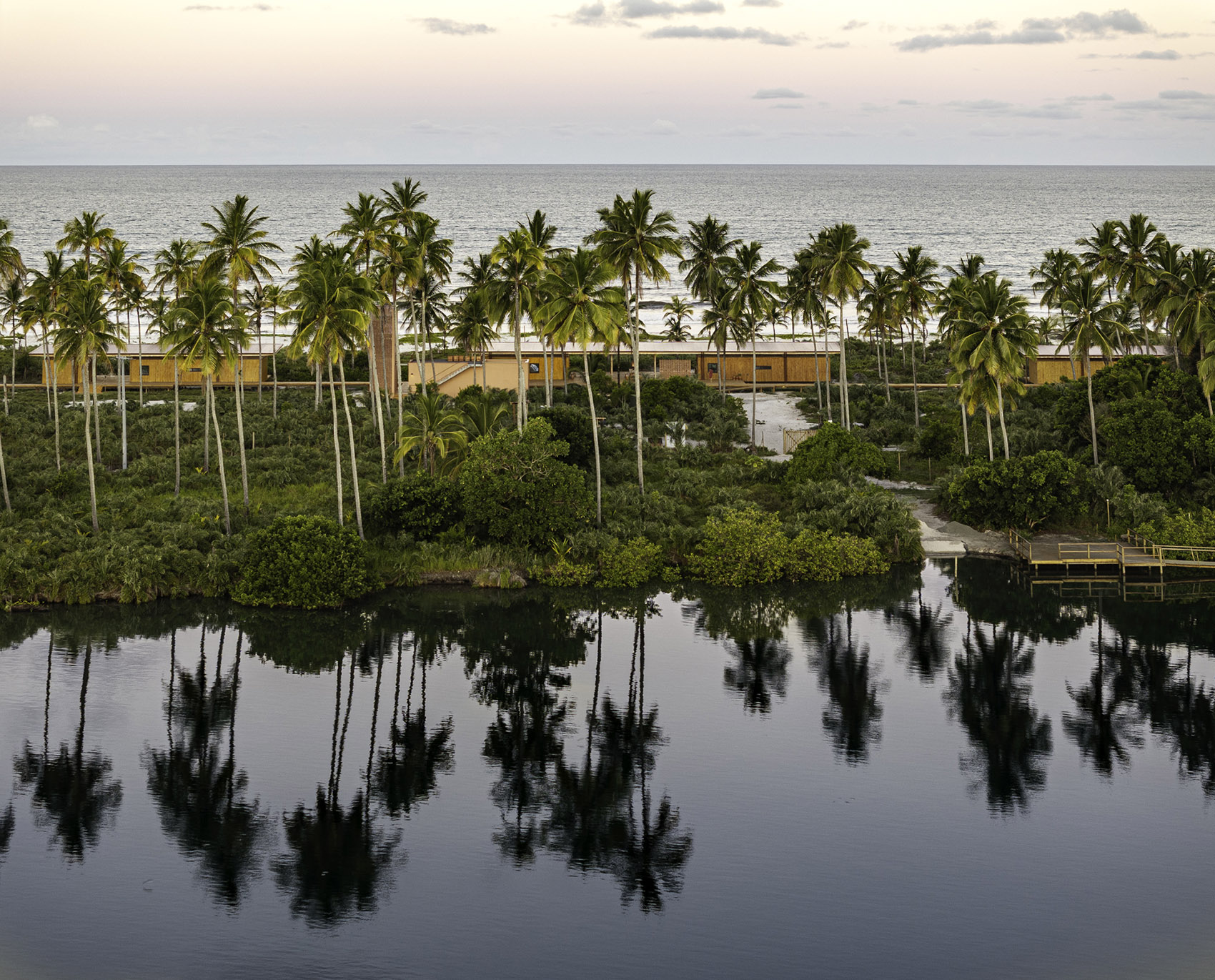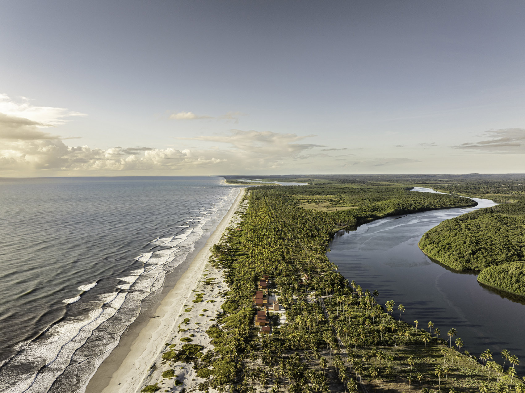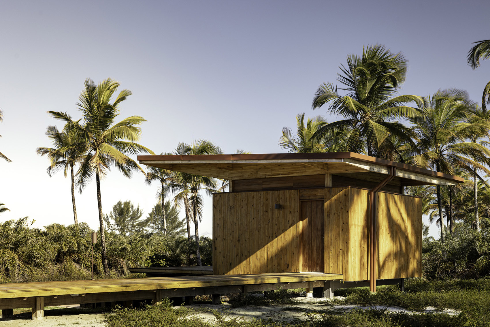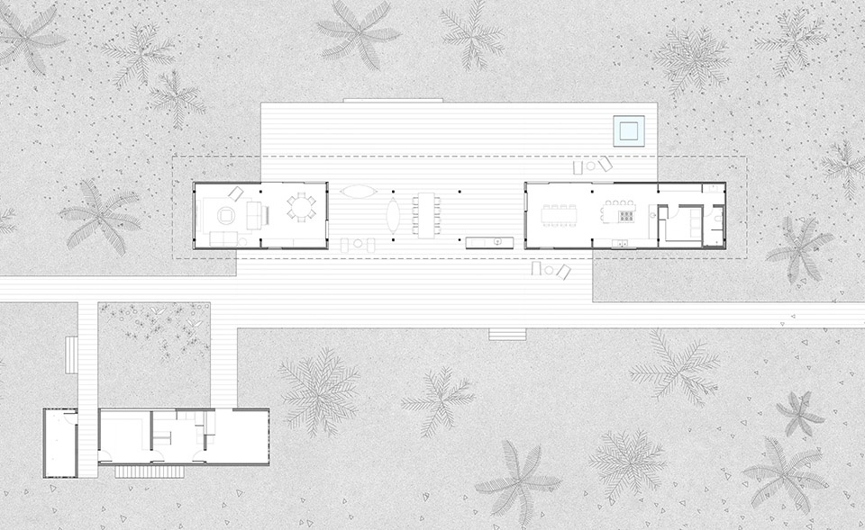 在河与海之间,位于巴伊亚北部海岸的半岛上,Modular Bahia模块化住宅项目提出了一种当代表达的热带栖居方式,对当地的地貌与气候保持敏感回应。该项目由UNA barbara e valentim建筑事务所设计,融合了工业化建造方案与生物气候策略,精准响应自然环境条件,并探索一种更契合景观的居住方式。
