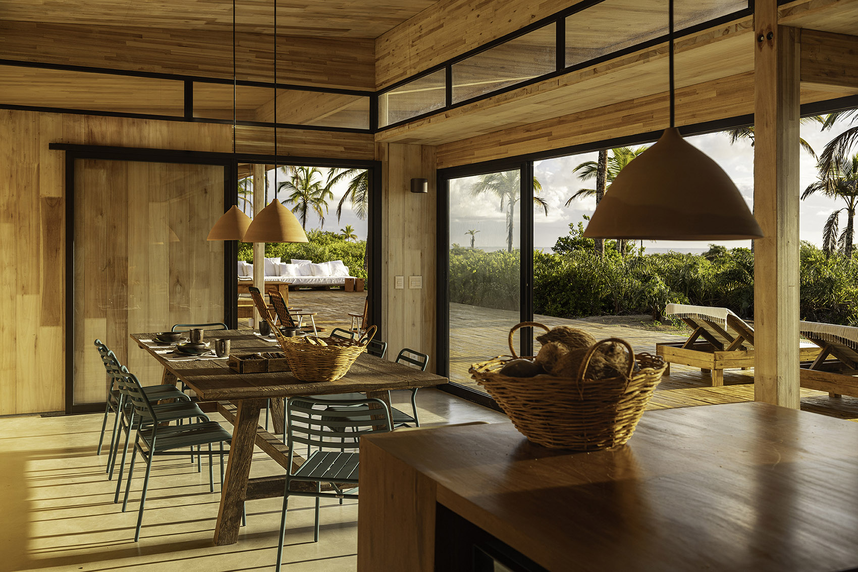 The interiors feature exposed wood on walls and ceilings. Large glass panels, shaded and protected by wide eaves, visually integrate the house with the stunning surrounding landscape. Broad wooden decks extend the indoor flooring to verandas, open terraces, and paths that connect the various modules of the house.