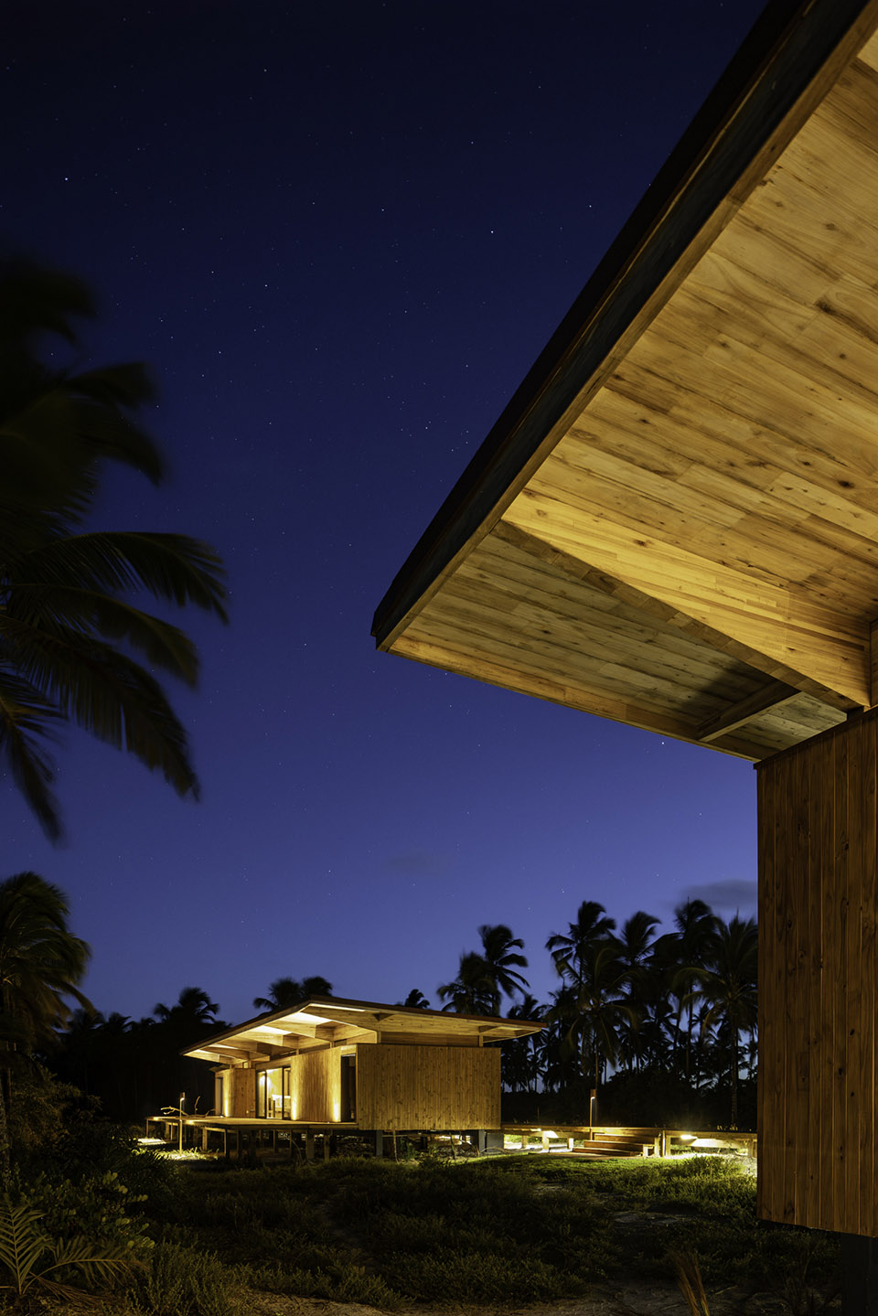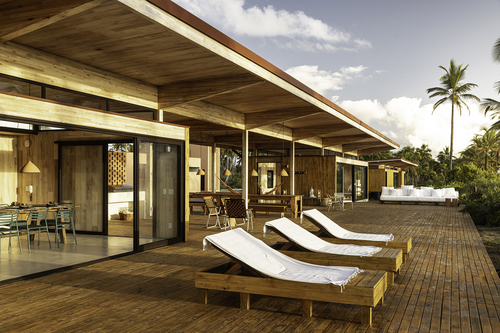 Sustainability strategies guide the project from the beginning: reforested wood as the main raw material, modularity of construction components, large eaves for shading and façade protection, window openings on opposite façades to ensure efficient cross-ventilation, water reuse systems, and passive energy generation. The sloped roof design facilitates hot air exhaust, ensuring thermal comfort even without air conditioning.