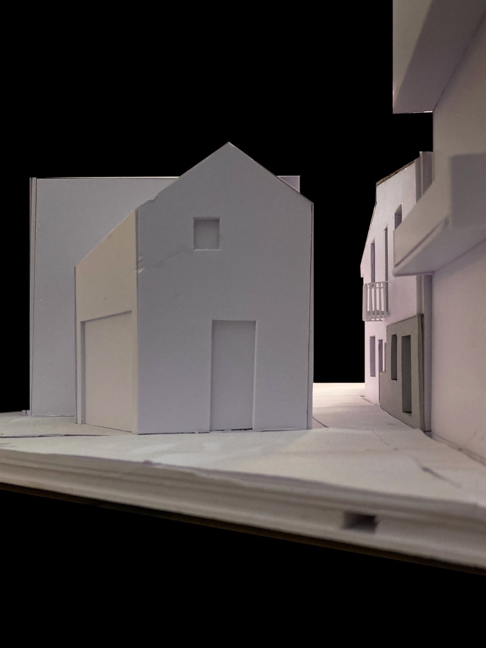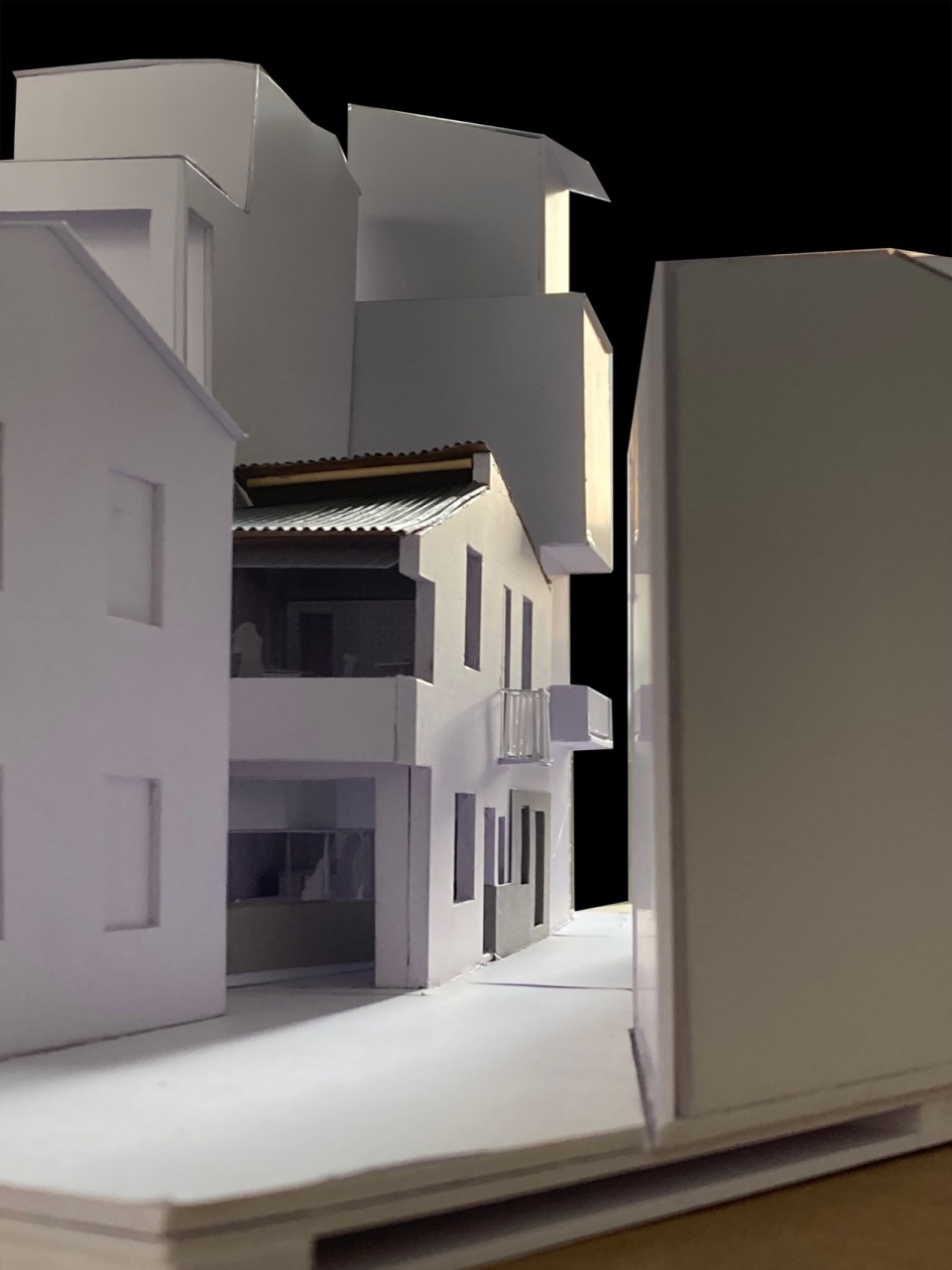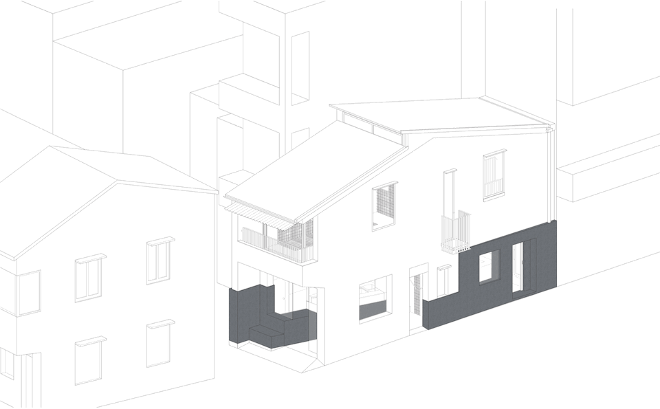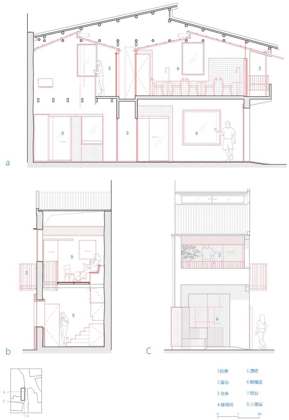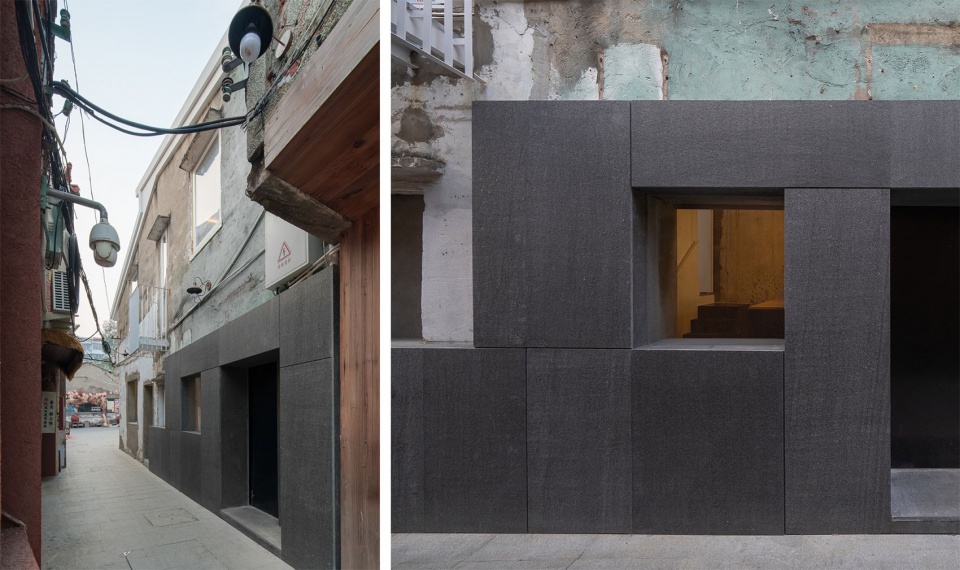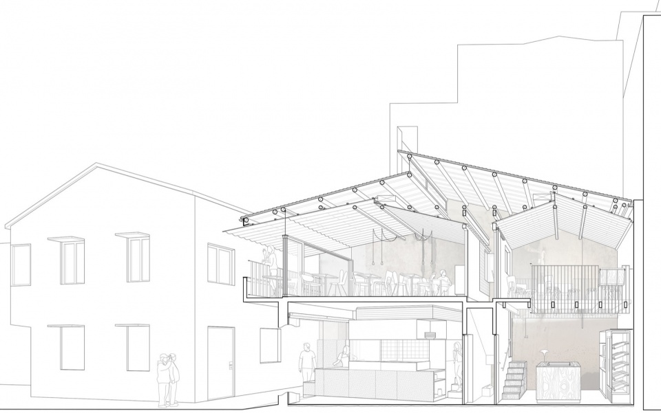 项目场地位于温州老城区双井头菜场三岔路口,原建筑为狭长的两层民居。设计布局舍弃常见的上下分层模式,而是将空间在水平方向上分开,通过设置两套独立的楼梯系统,建筑被划分为左右并排的两个单元,来实现咖喱店与酒吧的独立共存。