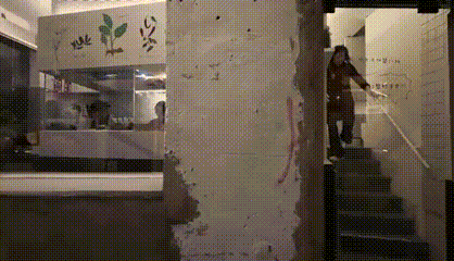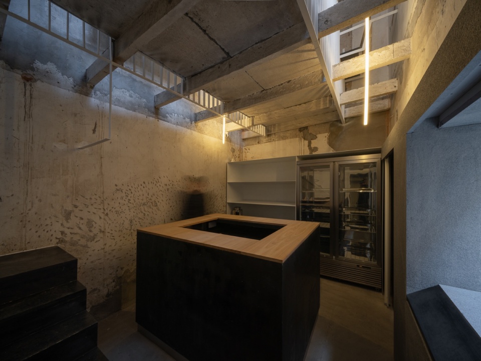 On the first floor, the bar on the right side is constructed with a relatively clear and enclosed inter-face using dark stone curtain walls, creating a visual buffer with the street; The curry shop on the left extends the stone curtain wall into the interior, running through the open kitchen to the other side facade. This curved wall introduces outdoor street paving into the interior, forming a “branch-ing path” that runs through the building together with angled openings, blurring the boundaries between indoor and outdoor areas. This gives the curry shop a dual sided street facing customer interface, presenting a different posture from the bar while continuing the flow and penetration characteristics of street markets.