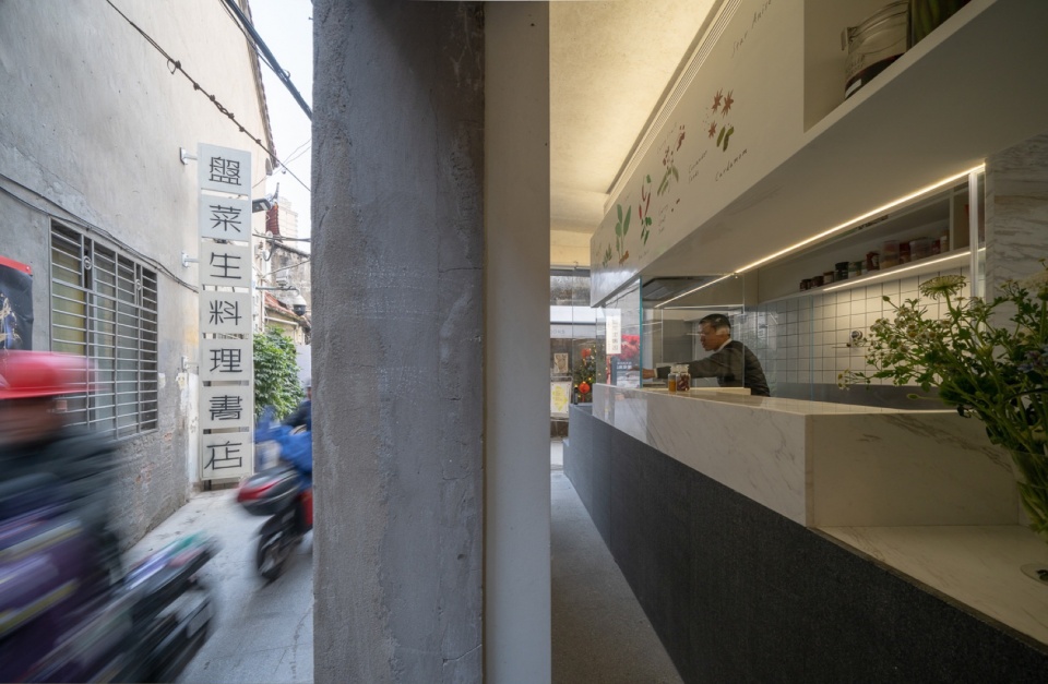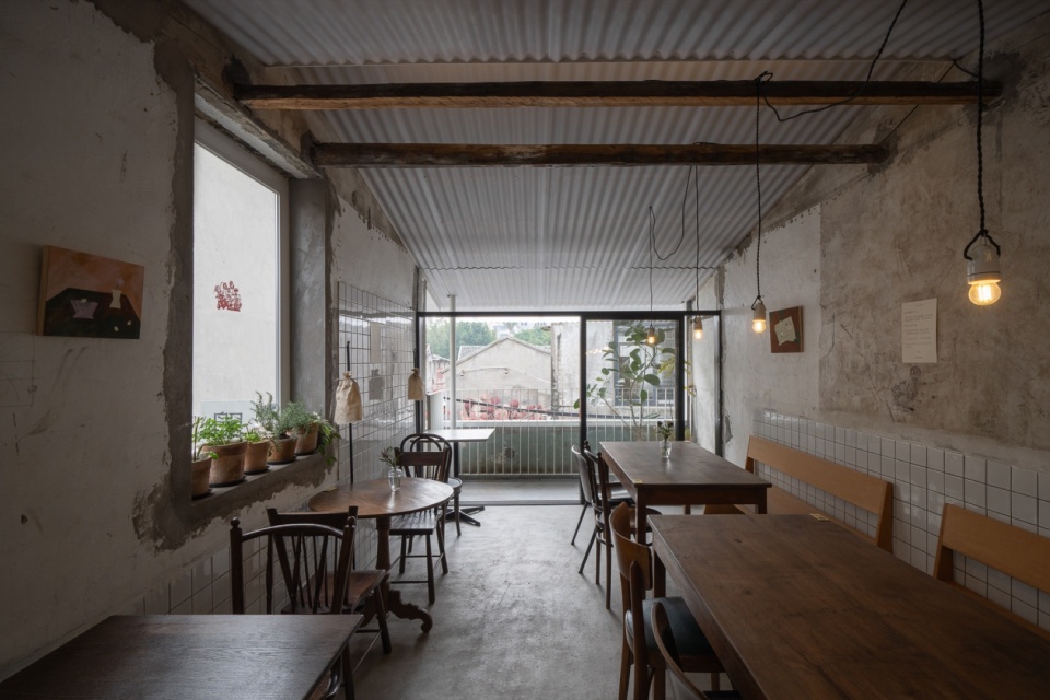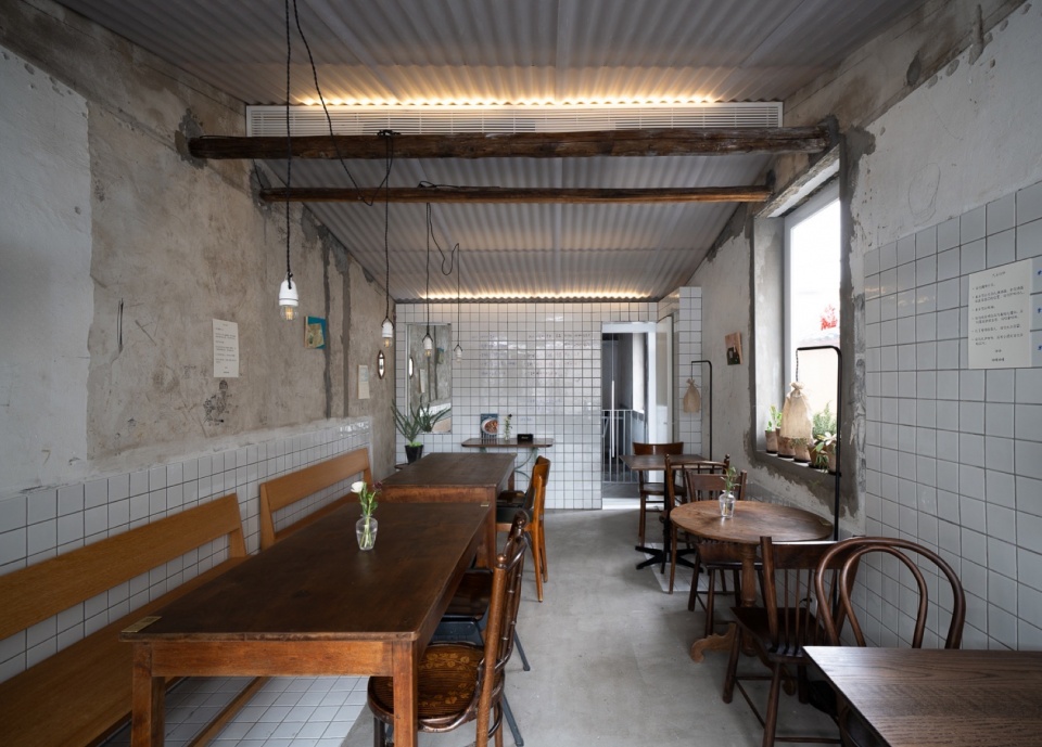 On the second floor, the curry shop has expanded the windows to form a recessed balcony, in-corporating the view of San Gang Temple Street into the dining view. The newly laid white mosaic tiles and color blocks alternate with the old and new walls, weaving into a flowing spatial pattern; The bar utilizes the structural characteristics of the original prefabricated floor slab and creates a social space that connects the upper and lower floors through local floor slab voids, allowing for interaction between sight and sound.