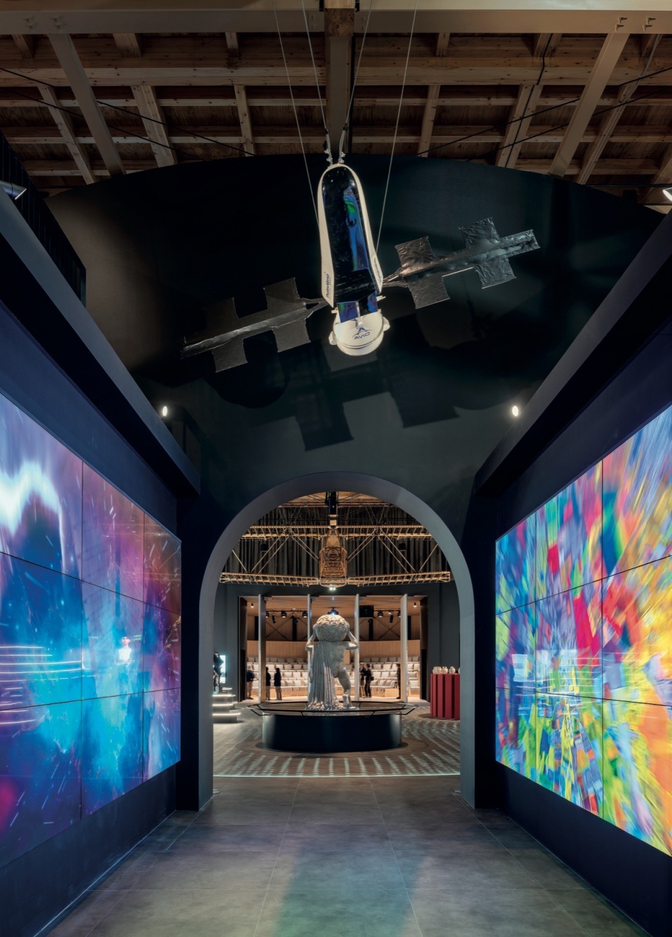 Next, the immersive Theater offers a continuous show, between digital set designs and live performances, that reinterprets the language of Italian Renaissance theater in dialogue with Japanese performance culture. The audience is not just a spectator but is involved in the stage action, in a hybrid experience between real and virtual. The journey then leads to the Ideal City area, a section that interprets in a contemporary key the concept of the Renaissance Ideal City in a broader, articulated and multidisciplinary meaning, in which the inhabited space is not limited to the urban area but becomes landscape, culture, air quality, health, infrastructure, art, technology. Through multimedia installations and iconic works –such as the Farnese Atlas or the Olympic Torches of Milano Cortina 2026 – the relationship among humans, environment, and culture is staged as the engines of urban and social regeneration.