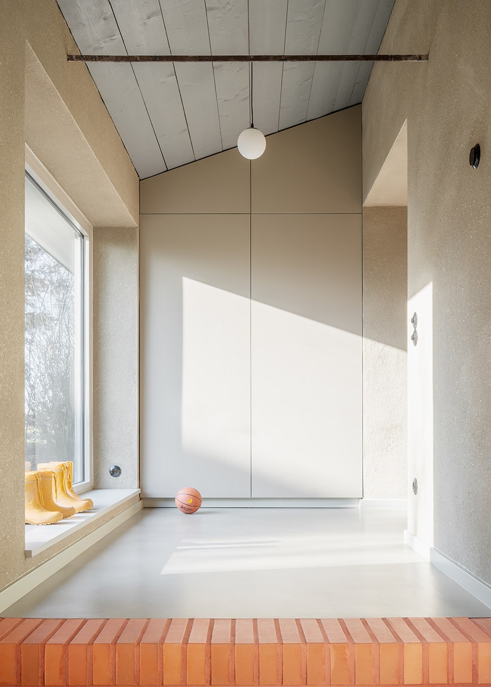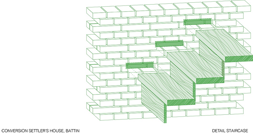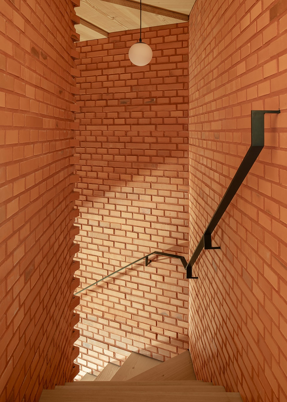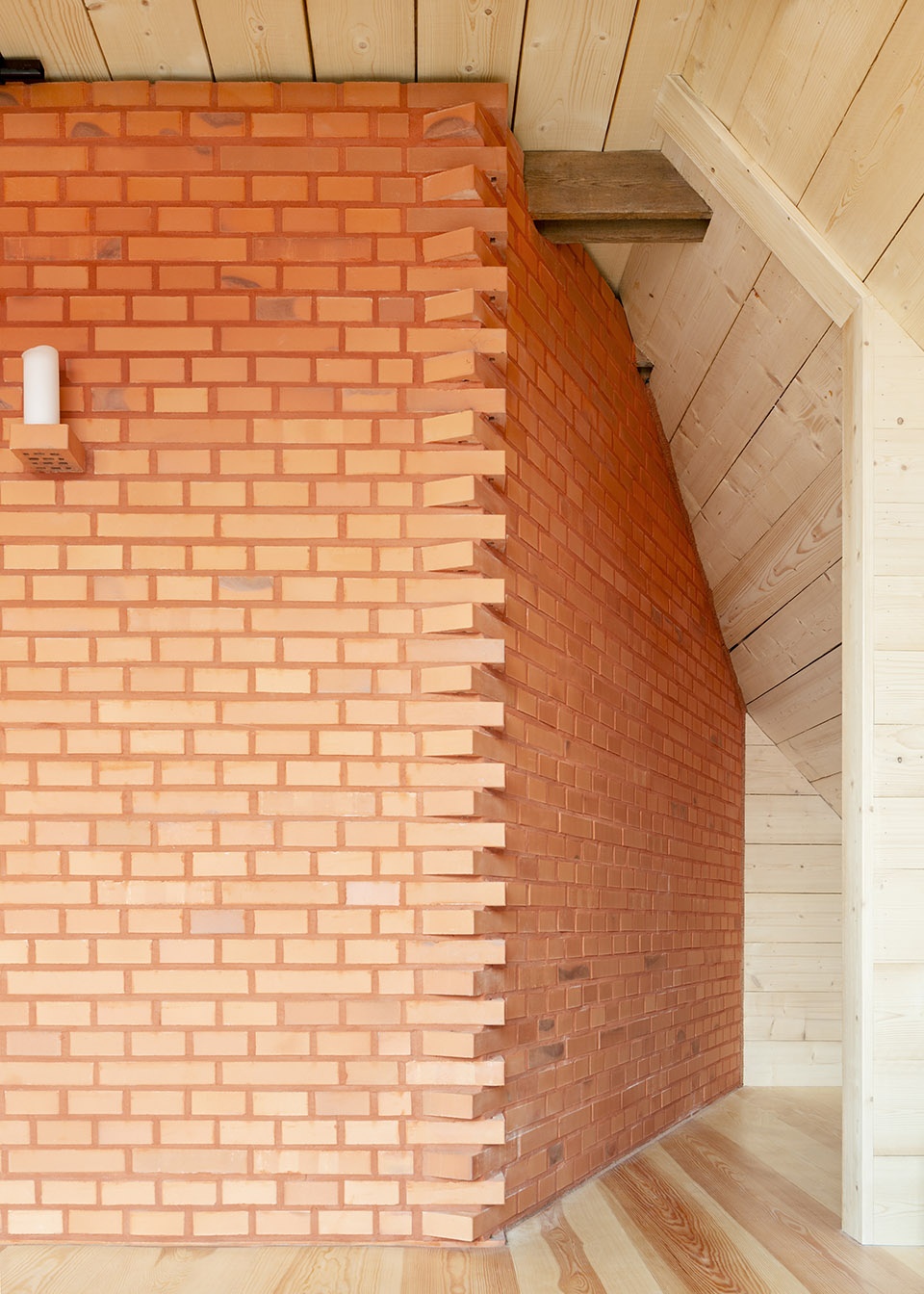The architectural context is a 1950’s settler’s house in a remote community 150 km north-east of Berlin. The conversion focusses on the interior of the petite, 2-story building. The logics of the interior spaces is reinterpreted with a sculptural room insert. This new spatial element made of exposed brickwork houses a staircase and the fireplace. Its unique quality is created by the precision the few materials are crafted with. The choice of brick format and its jointing follows the gradient of the wooden steps, which are precisely integrated into the brickwork. The shape of the sculptural room insert follows the directions of movement and the visual relationships of the surrounding living spaces. Its design is robust, differentiated and adaptive.